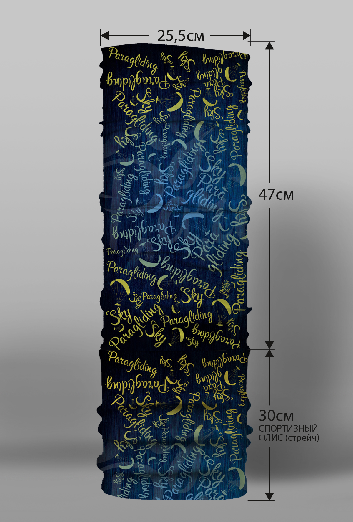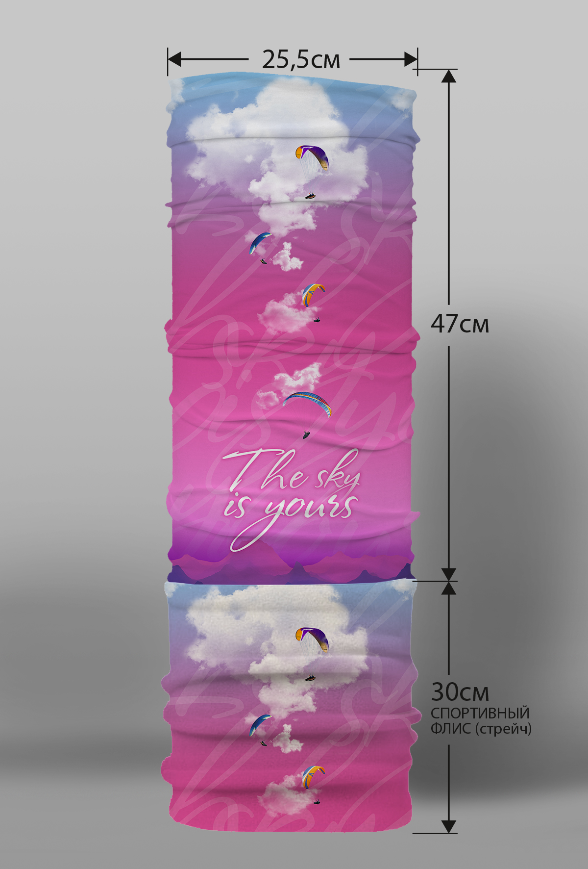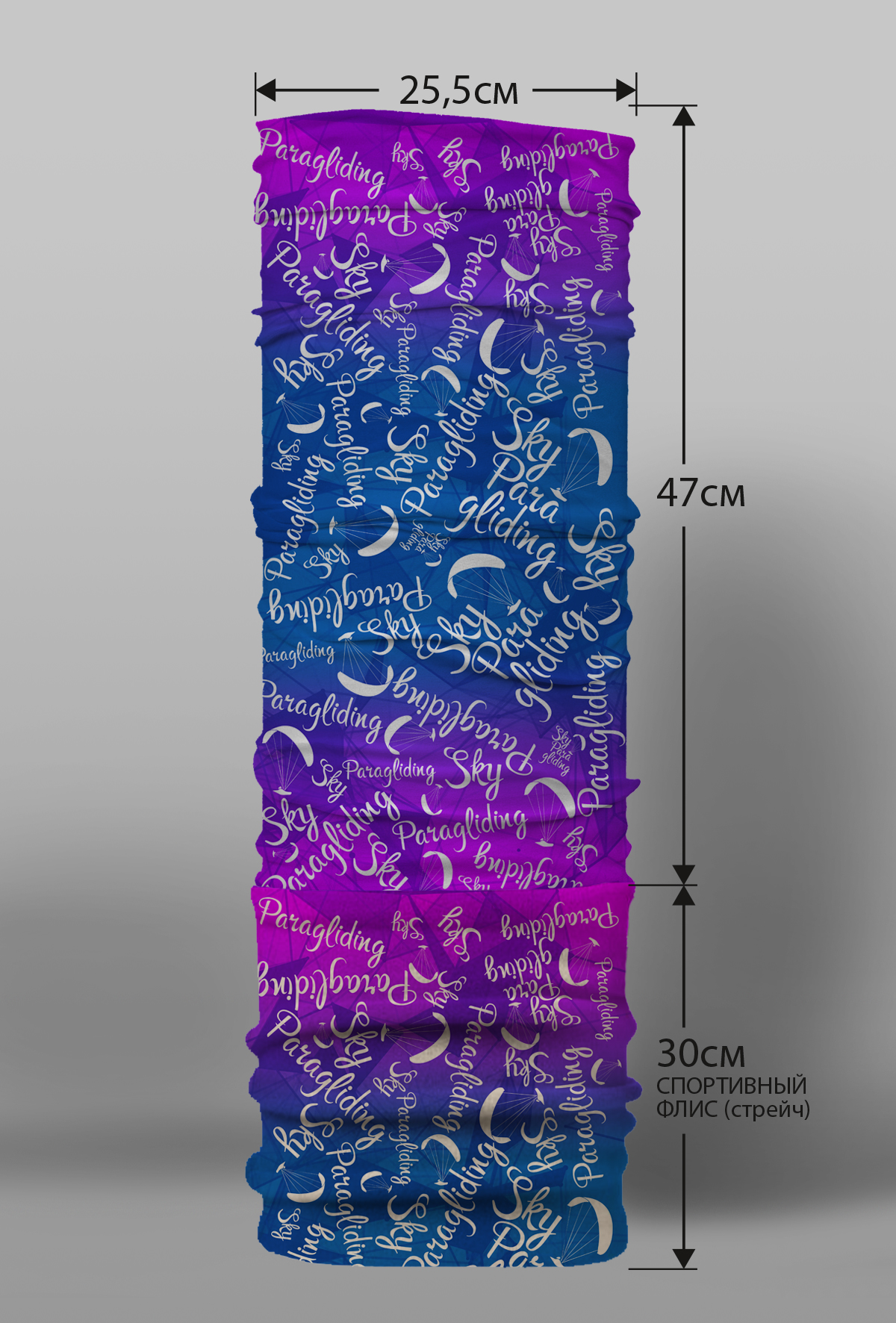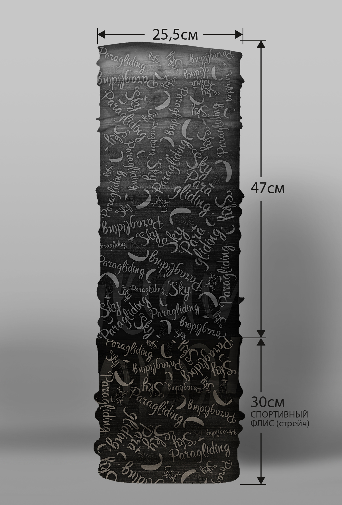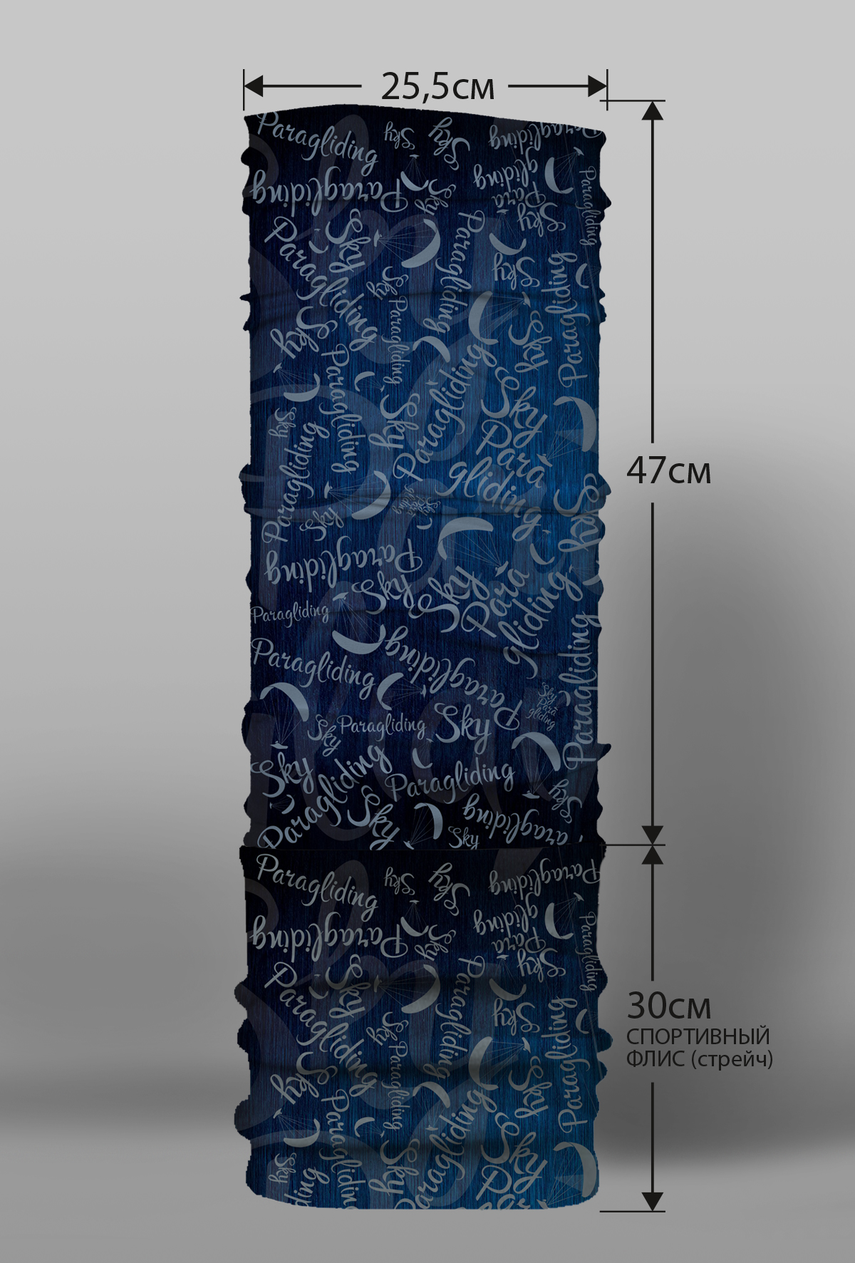 Верх остался как и прежде — микрофибра из полиэстера. Низ сделан из спортивного флиса, который тянется на 300% в ширину и имеет такой-же принт, как и основной бафф с небольшим оттенком (разные материалы по разному впитывают краску, поэтому будет немного отличаться).