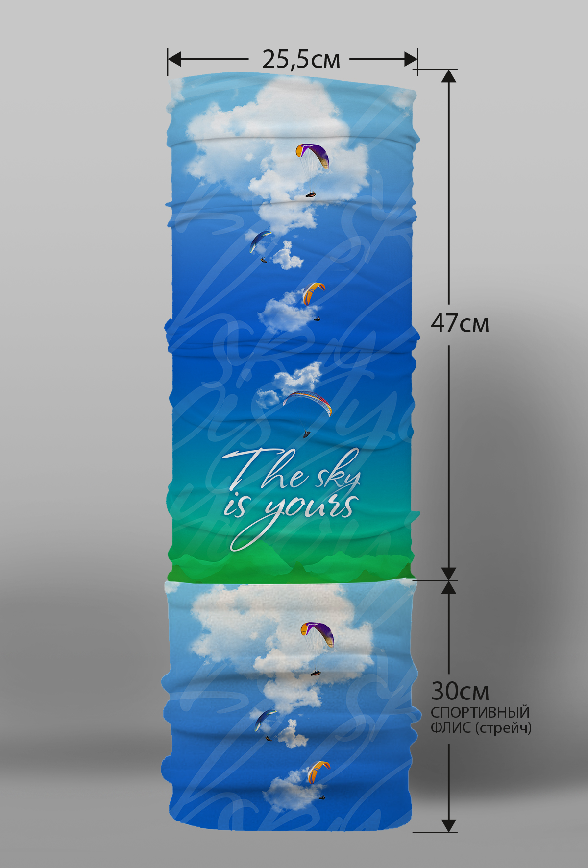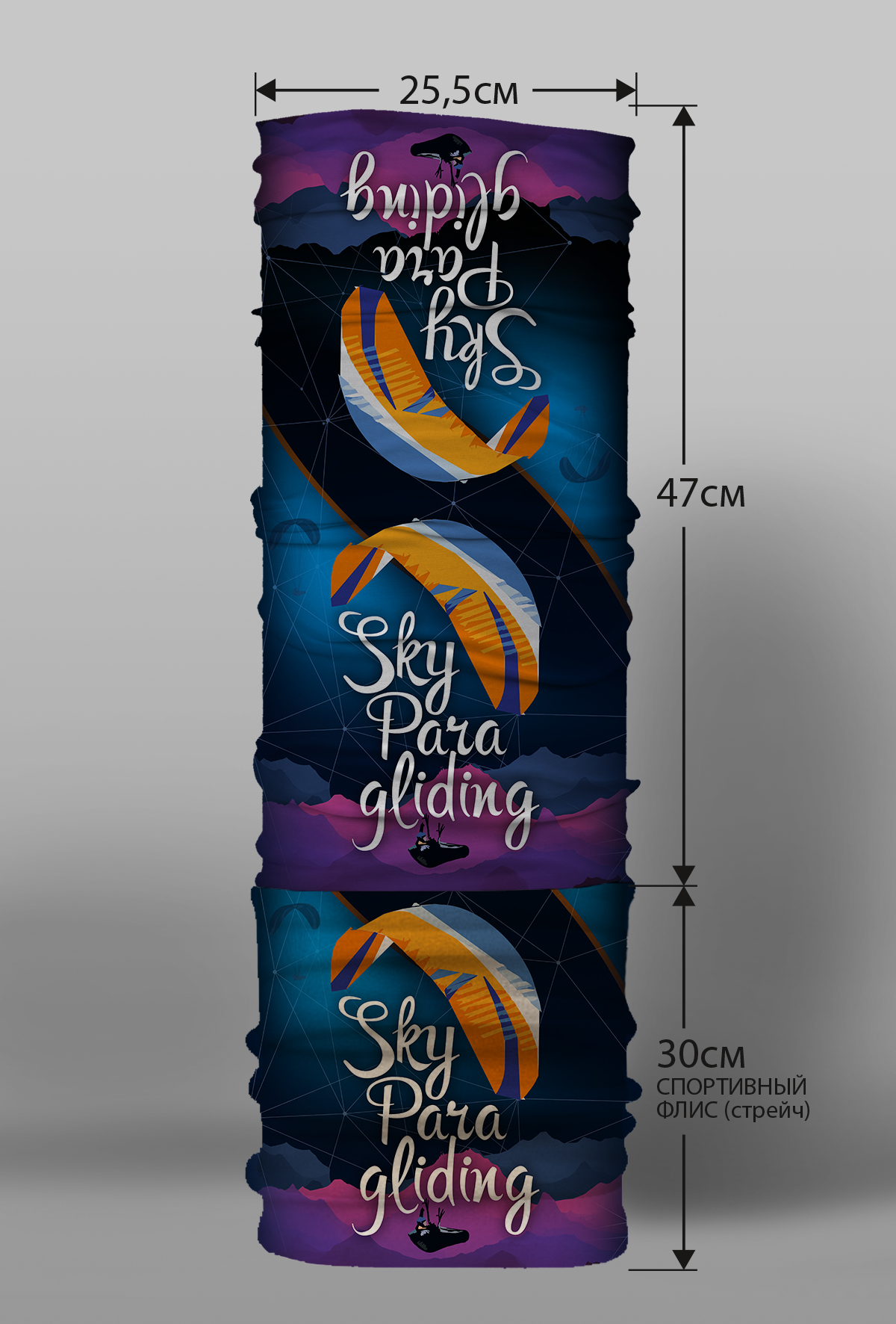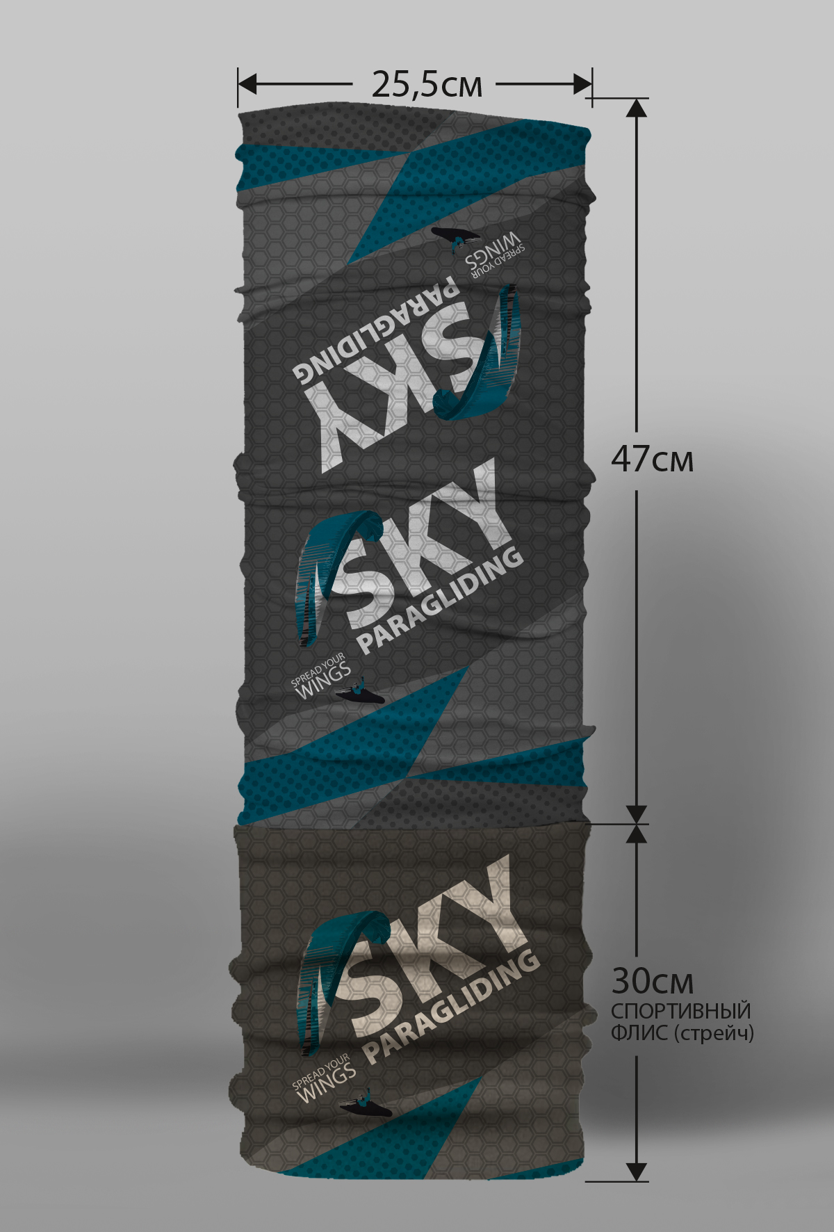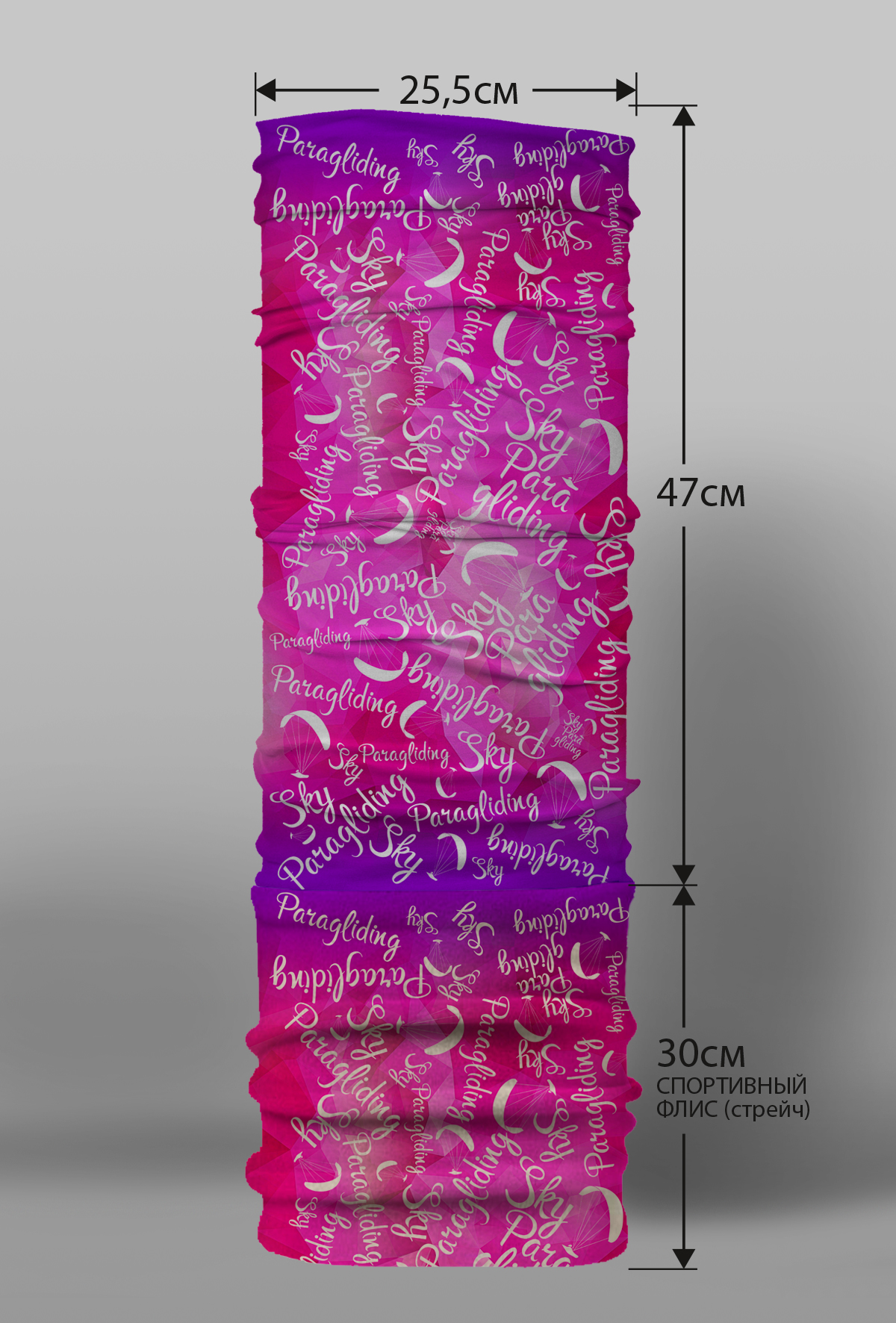 Верх остался как и прежде — микрофибра из полиэстера. Низ сделан из спортивного флиса, который тянется на 300% в ширину и имеет такой-же принт, как и основной бафф с небольшим оттенком (разные материалы по разному впитывают краску, поэтому будет немного отличаться).