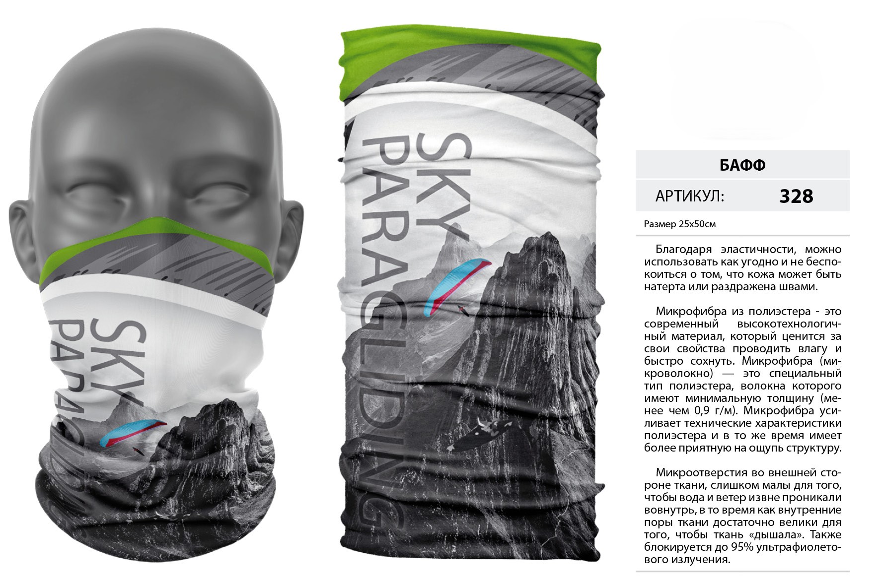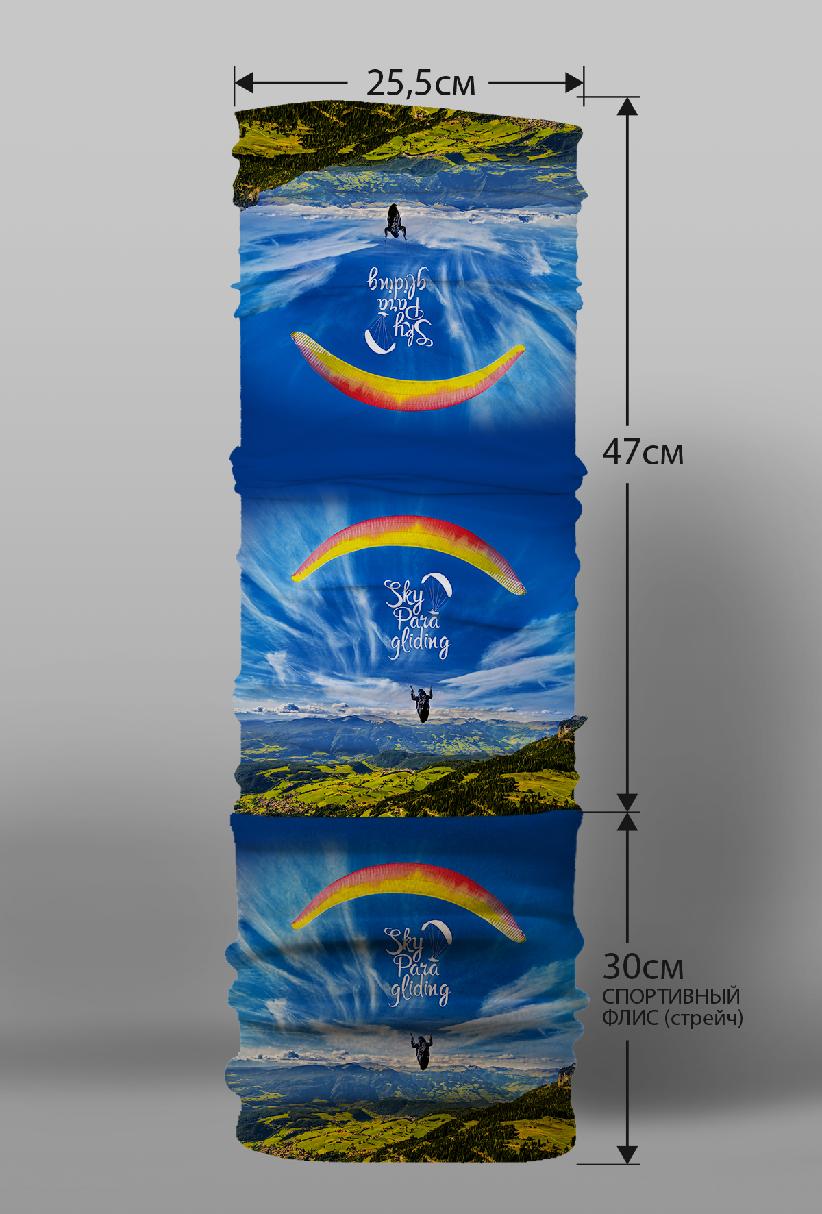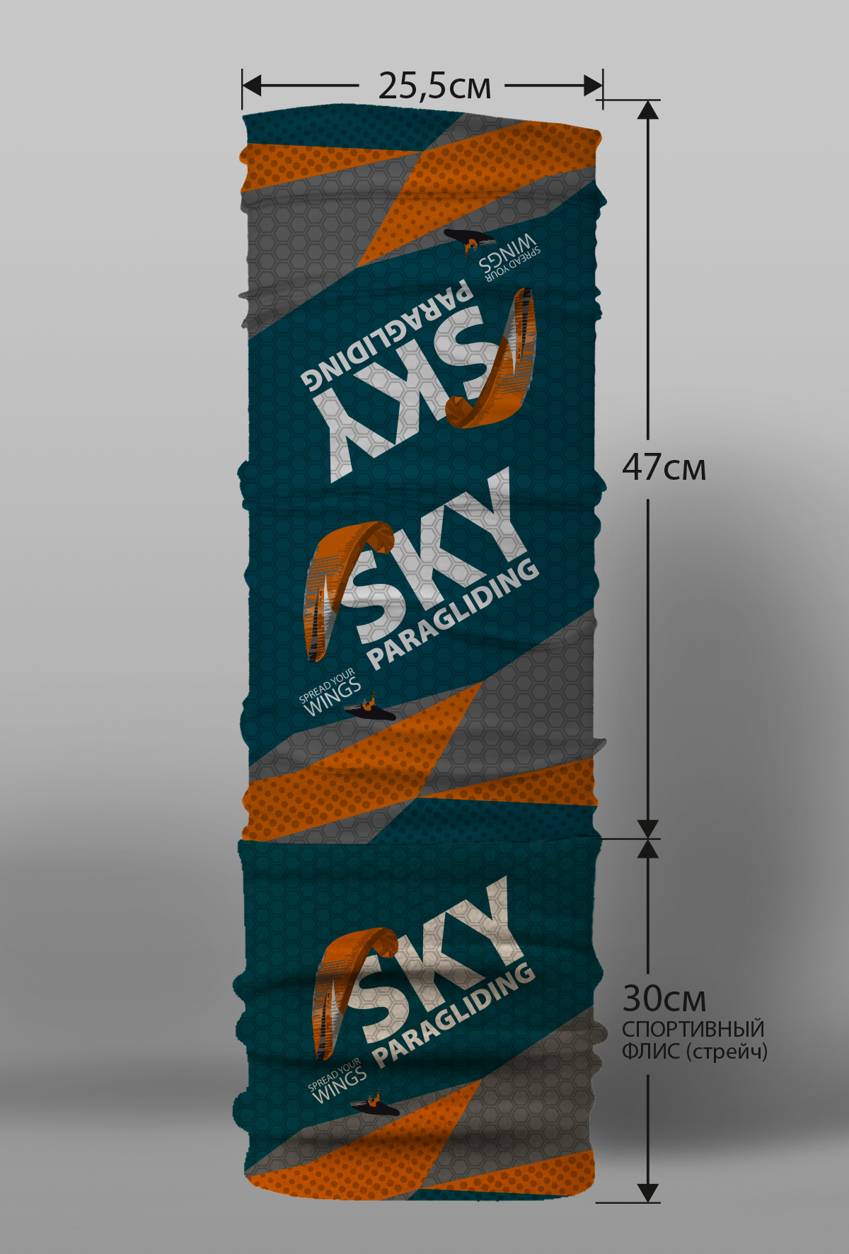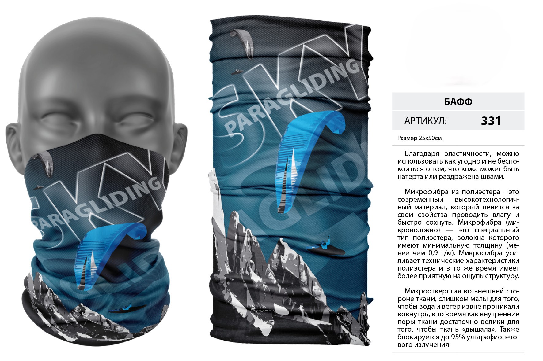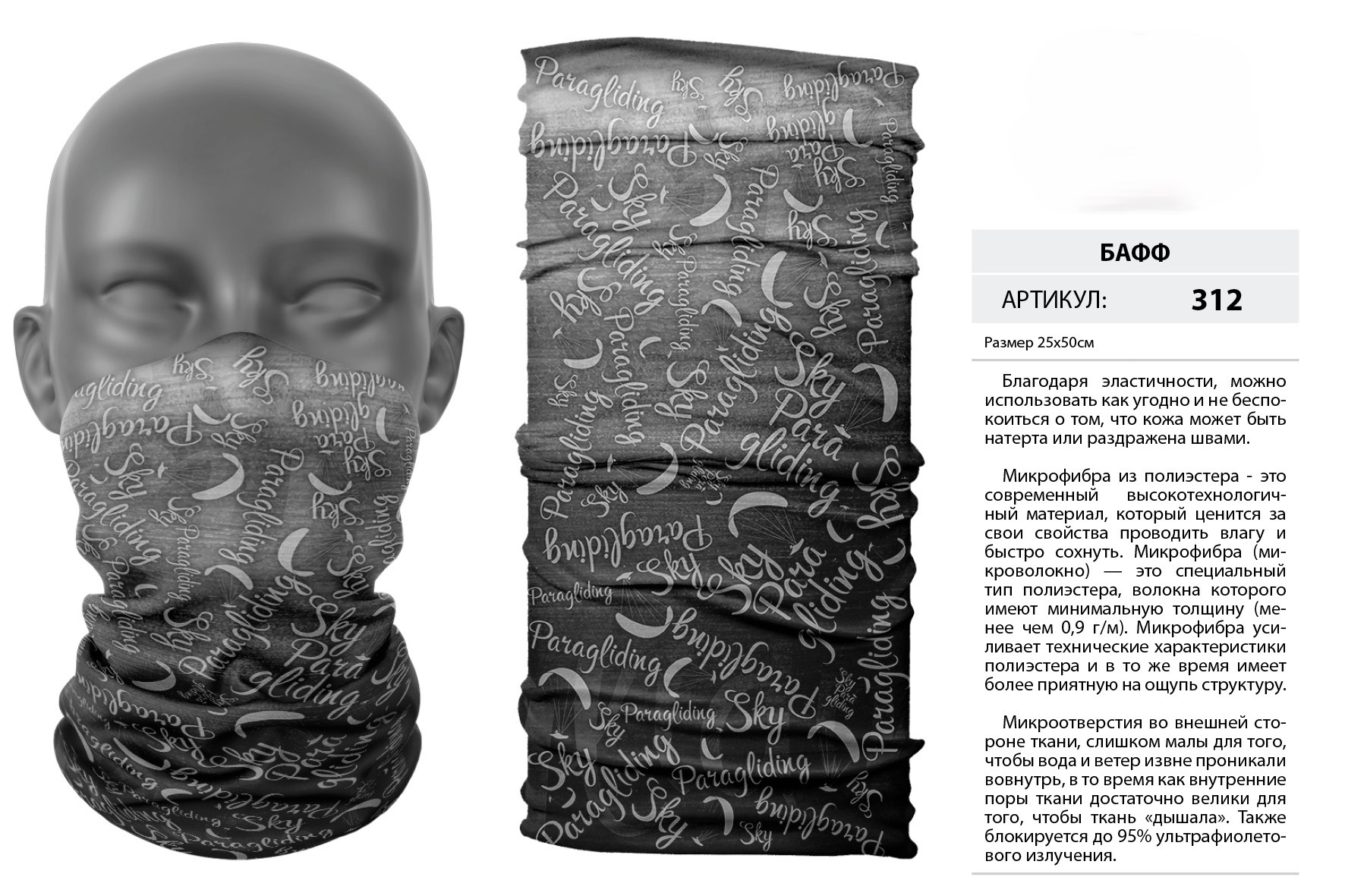 Верх остался как и прежде — микрофибра из полиэстера. Низ сделан из спортивного флиса, который тянется на 300% в ширину и имеет такой-же принт, как и основной бафф с небольшим оттенком (разные материалы по разному впитывают краску, поэтому будет немного отличаться).