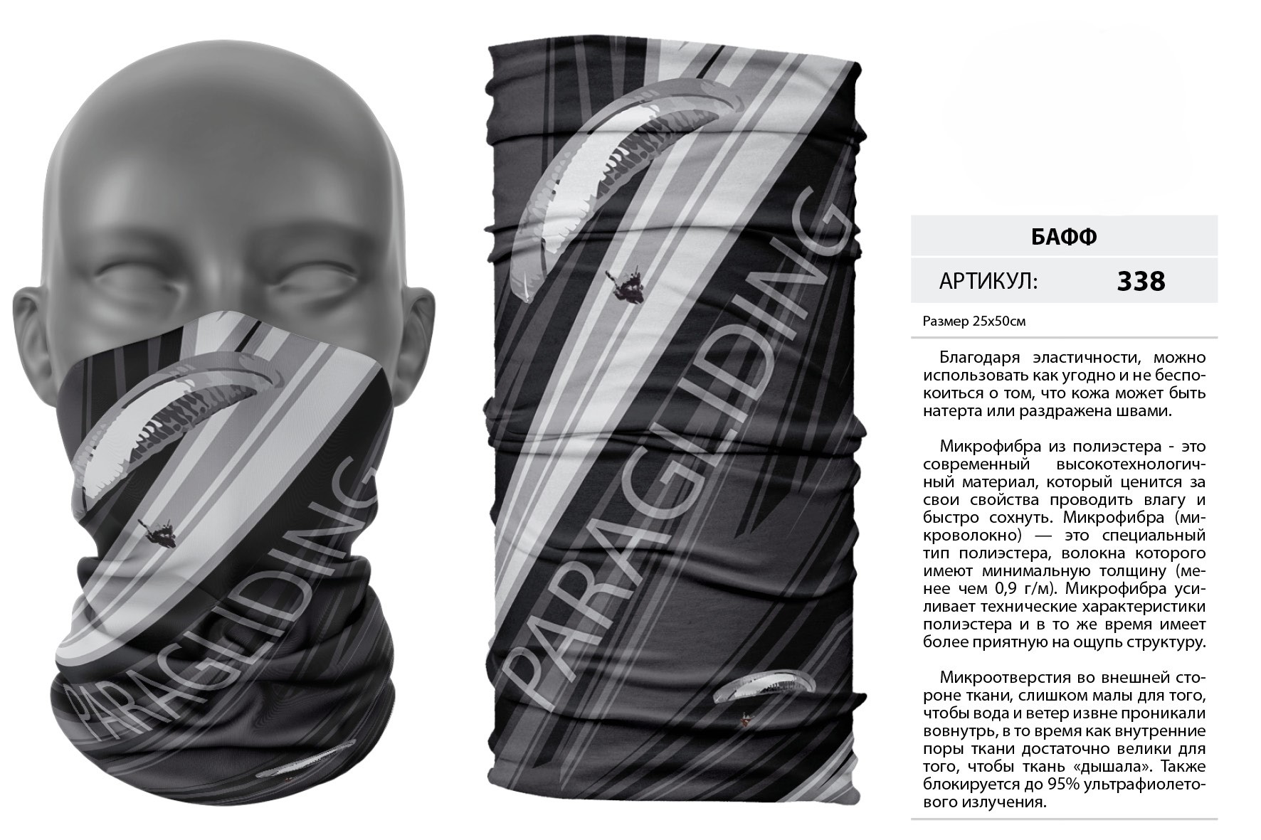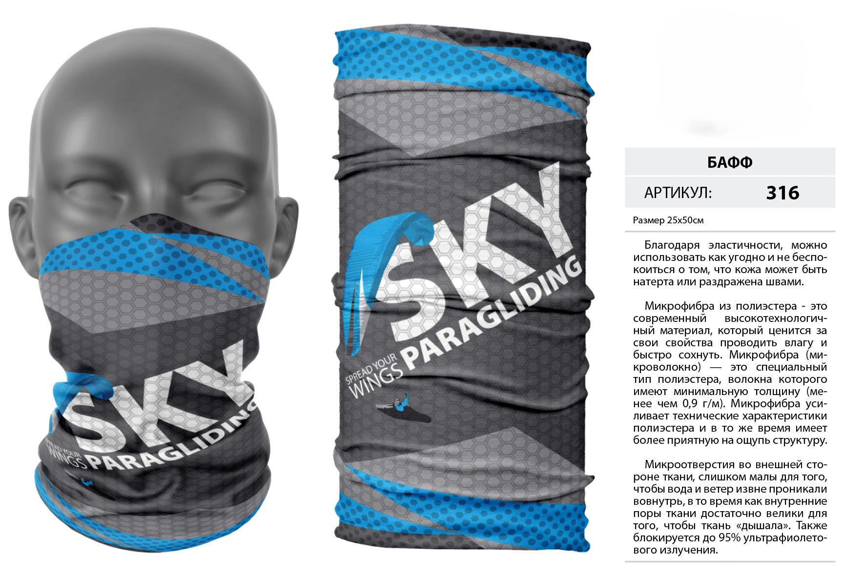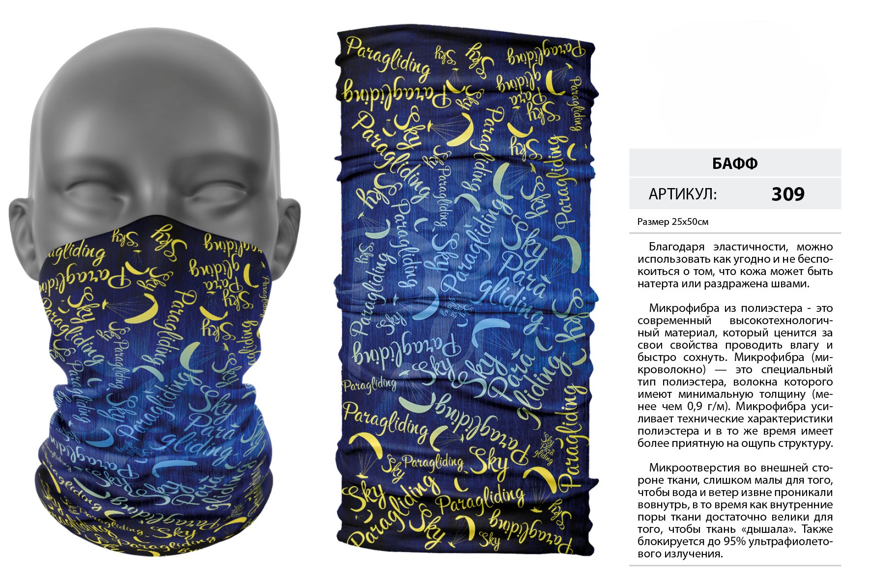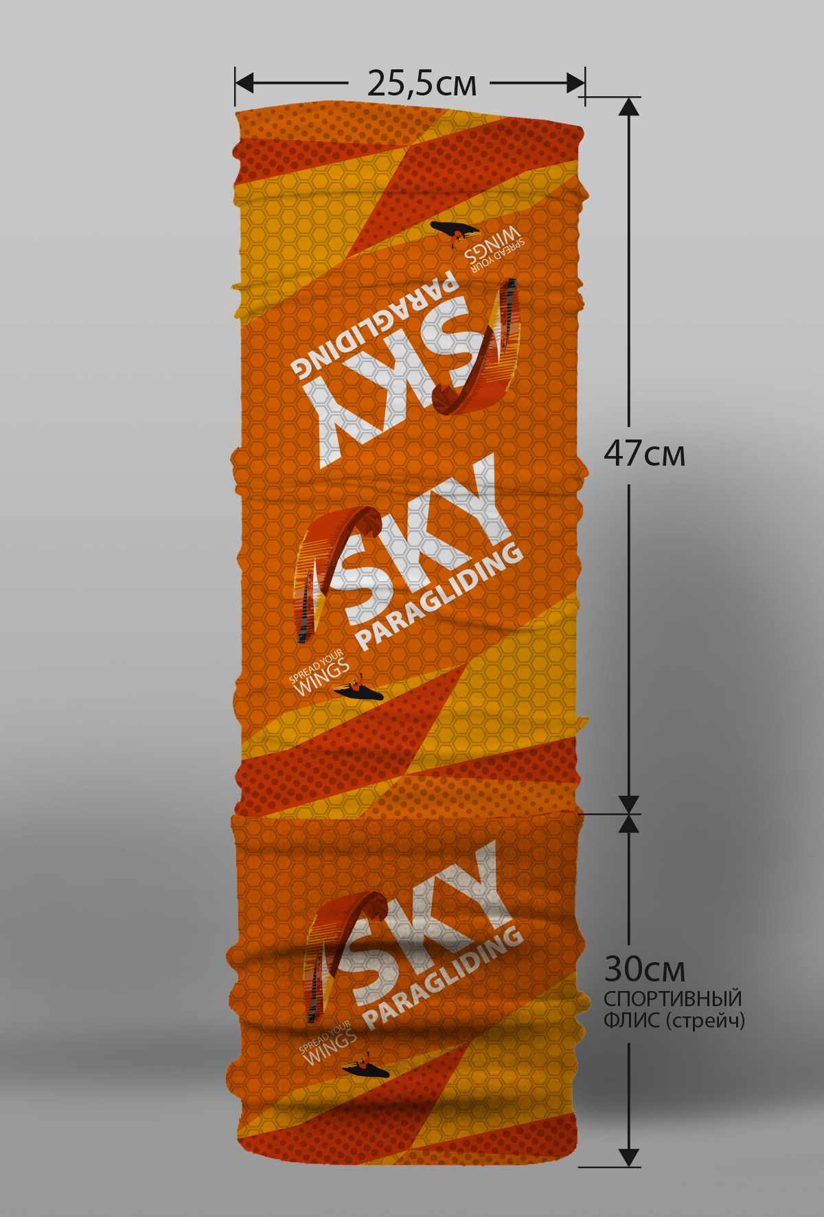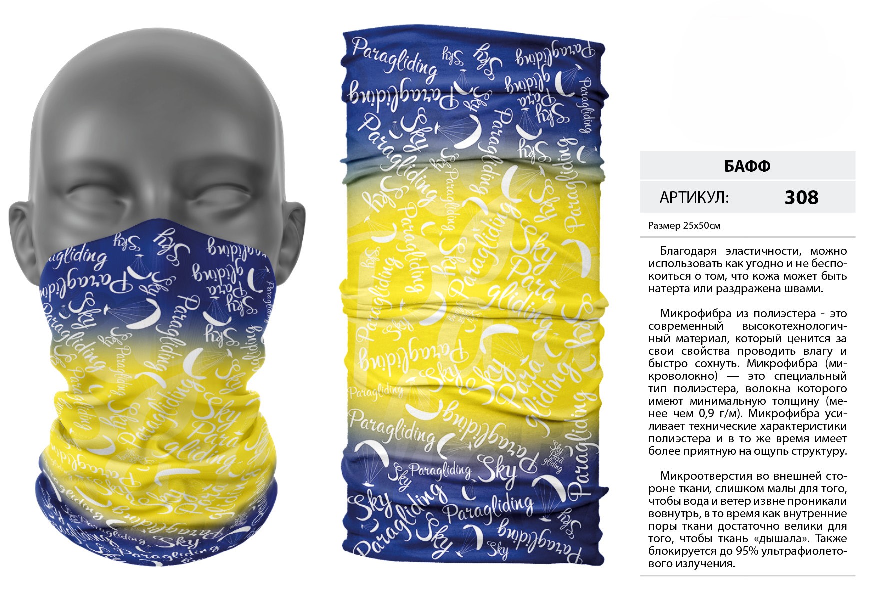 Верх остался как и прежде — микрофибра из полиэстера. Низ сделан из спортивного флиса, который тянется на 300% в ширину и имеет такой-же принт, как и основной бафф с небольшим оттенком (разные материалы по разному впитывают краску, поэтому будет немного отличаться).