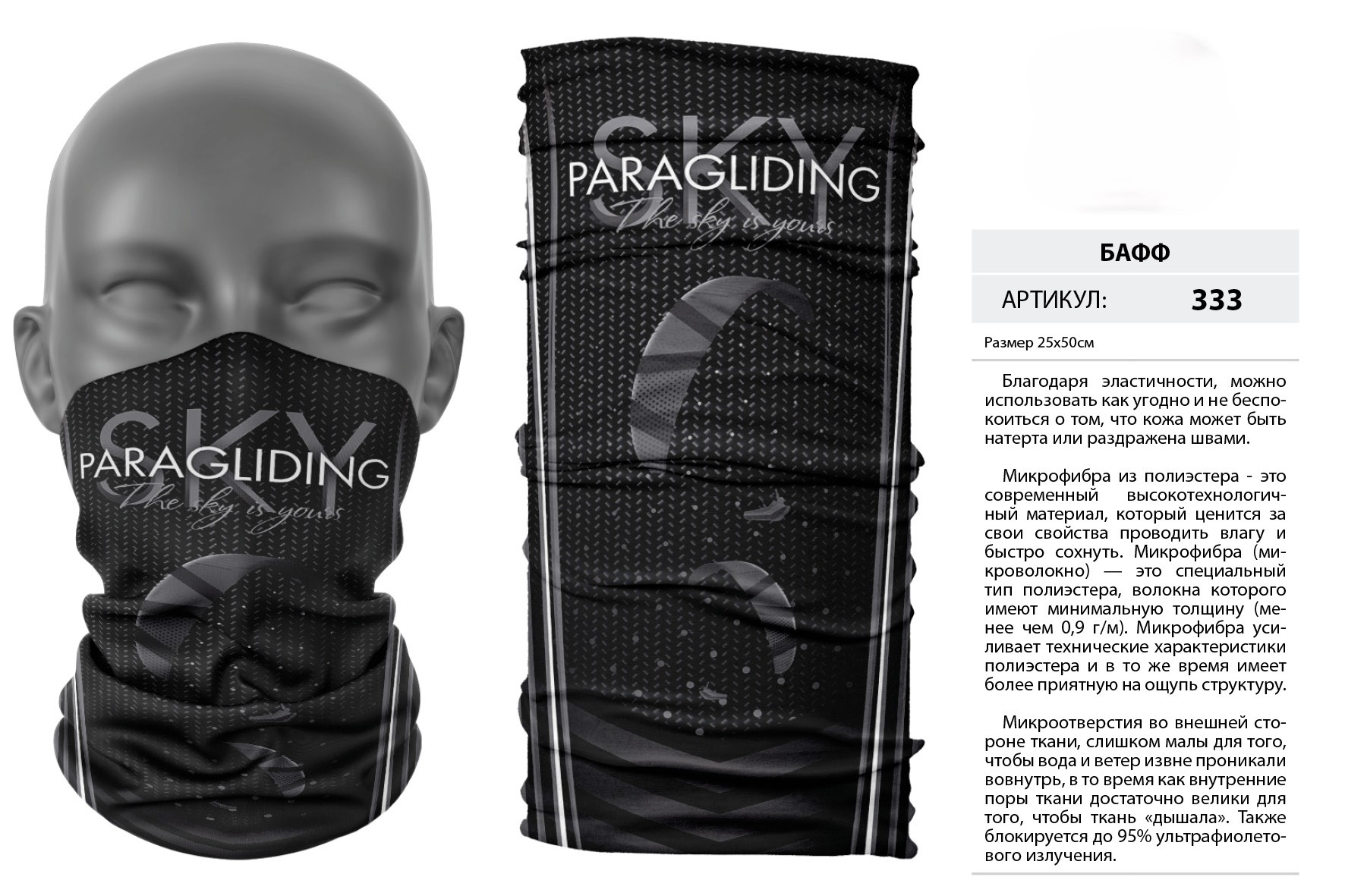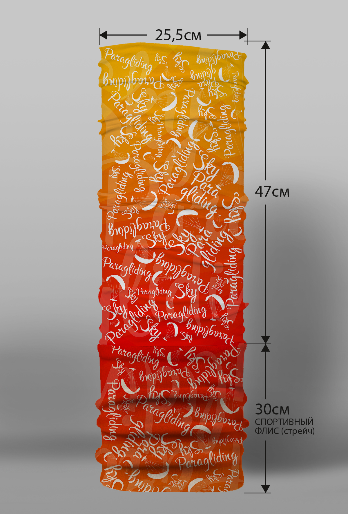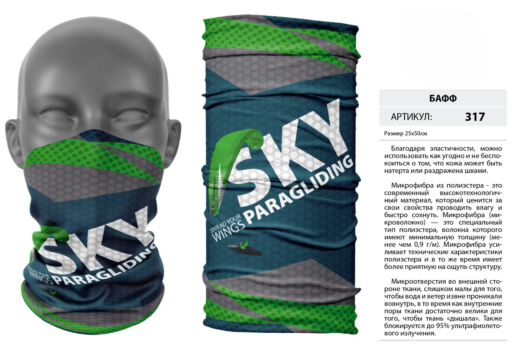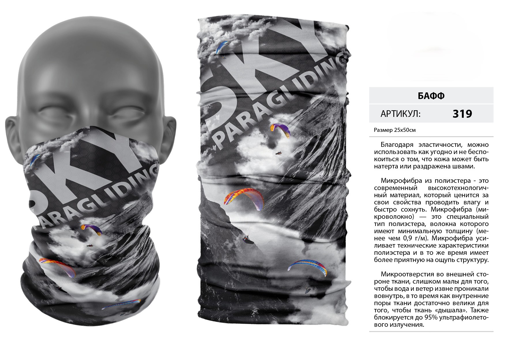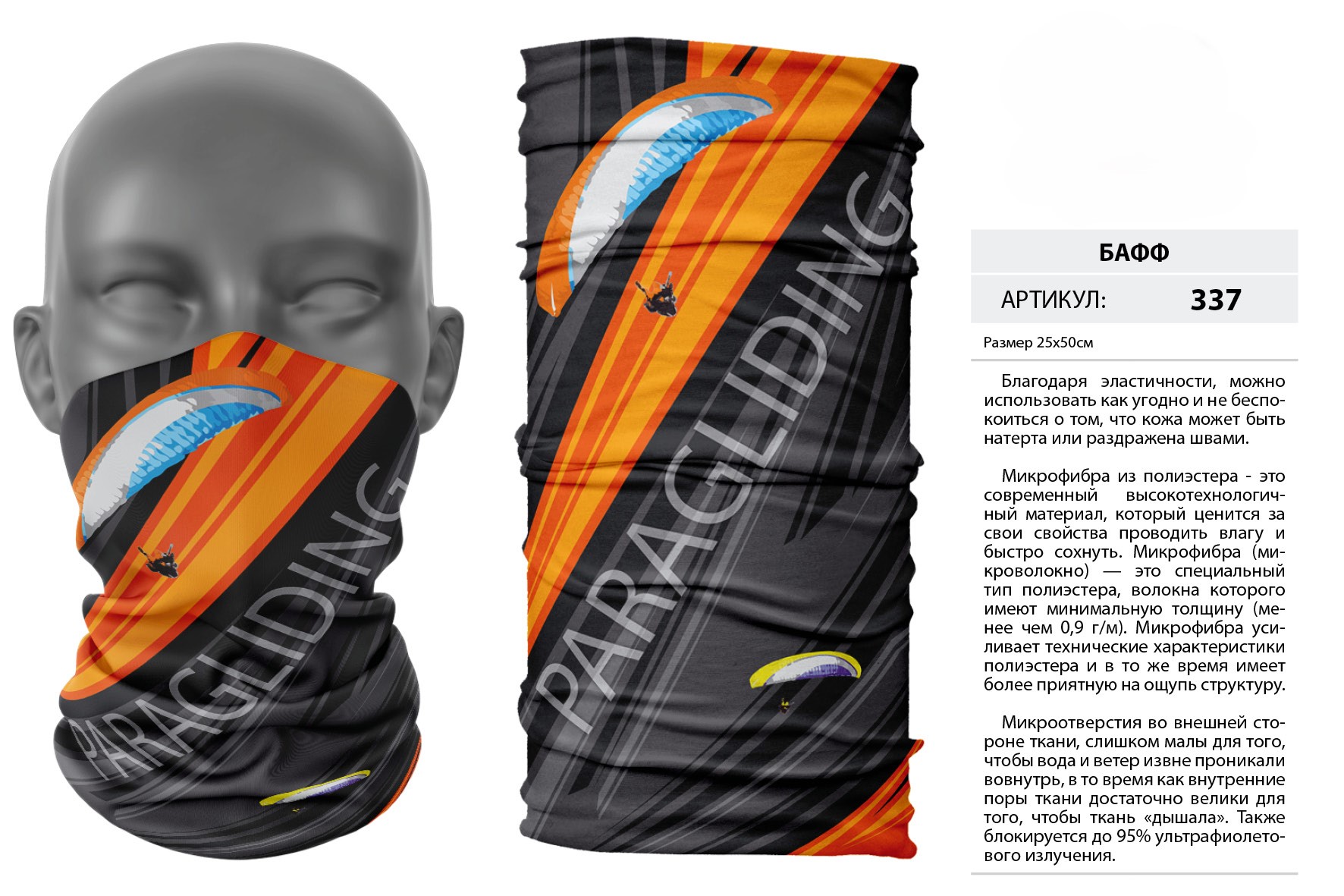 Верх остался как и прежде — микрофибра из полиэстера. Низ сделан из спортивного флиса, который тянется на 300% в ширину и имеет такой-же принт, как и основной бафф с небольшим оттенком (разные материалы по разному впитывают краску, поэтому будет немного отличаться).