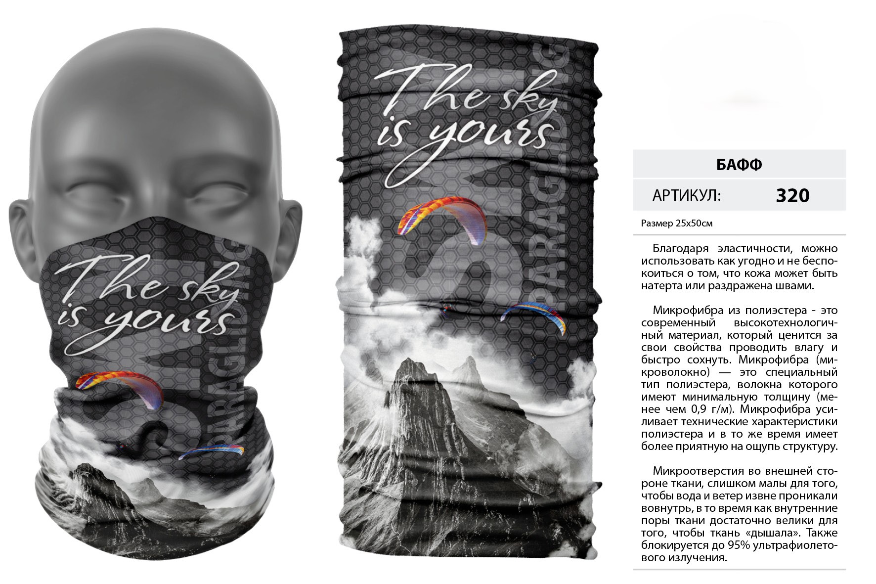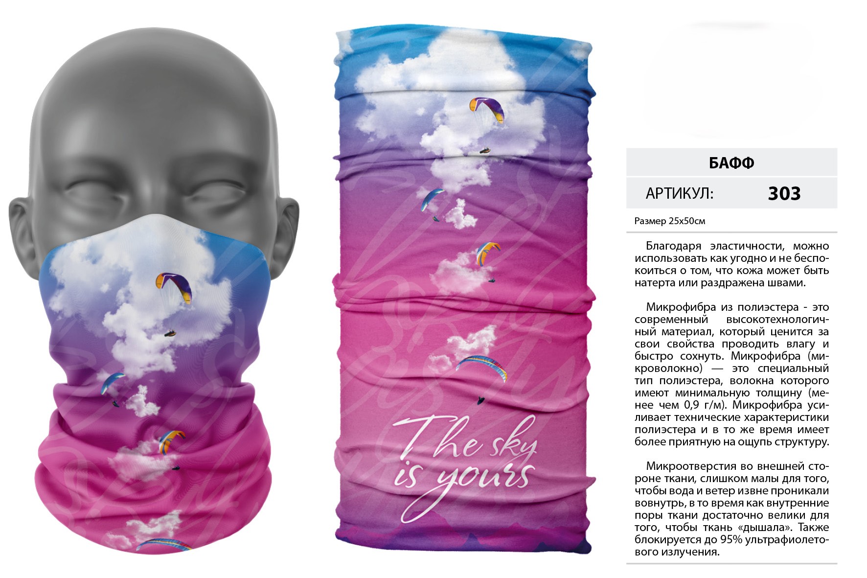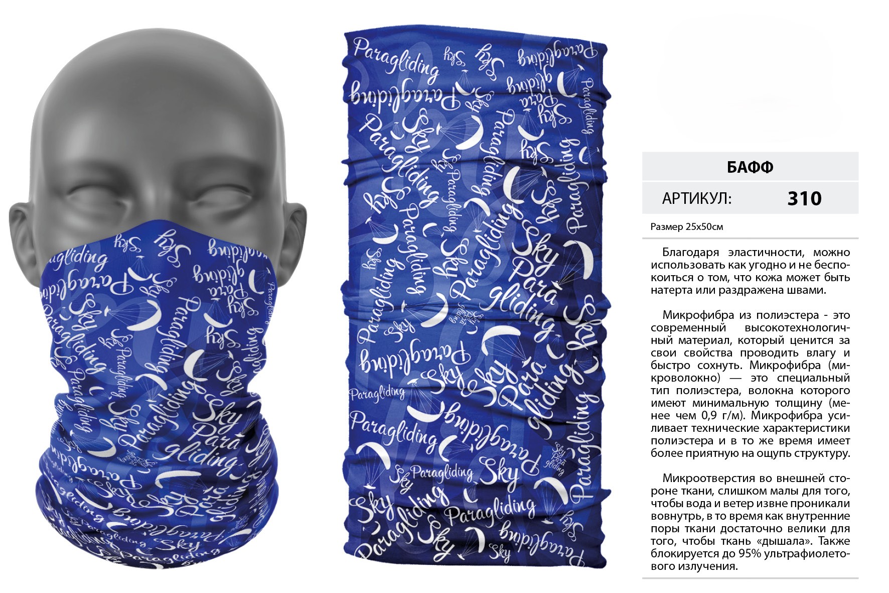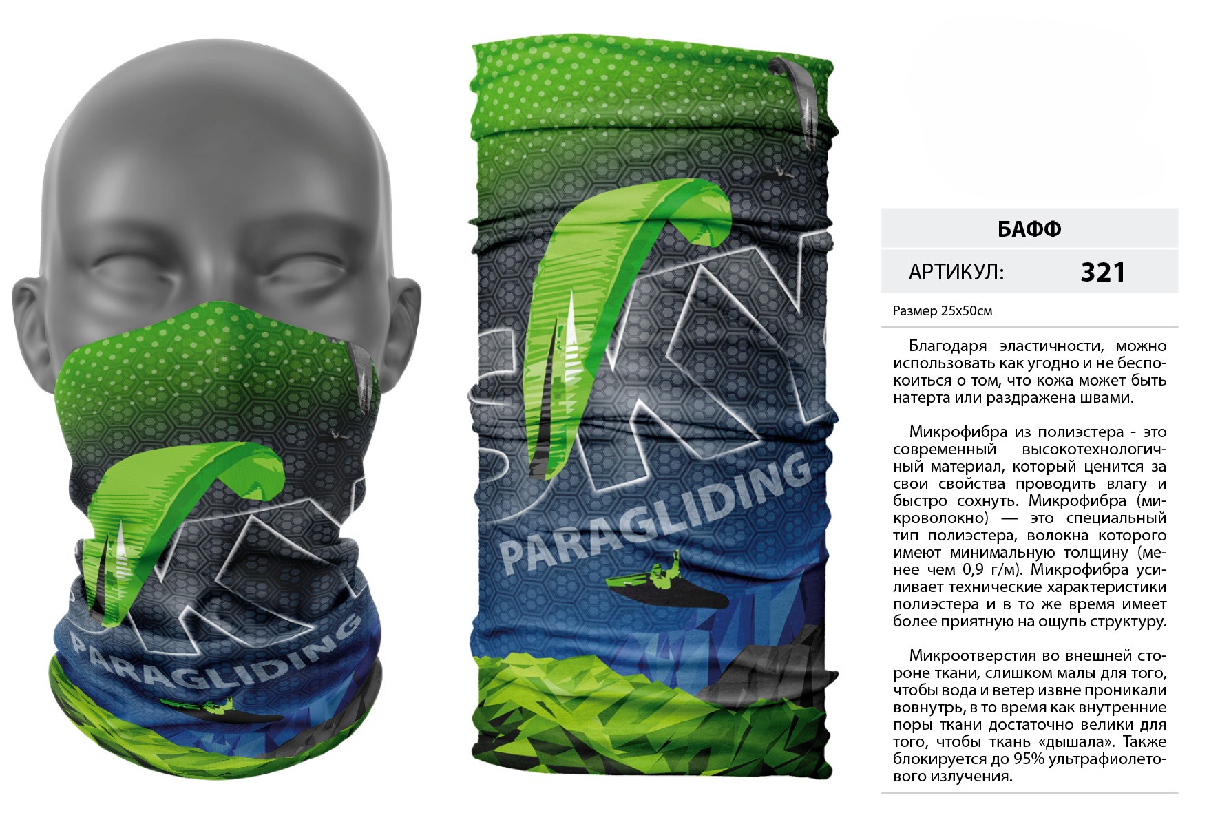 Верх остался как и прежде — микрофибра из полиэстера. Низ сделан из спортивного флиса, который тянется на 300% в ширину и имеет такой-же принт, как и основной бафф с небольшим оттенком (разные материалы по разному впитывают краску, поэтому будет немного отличаться).