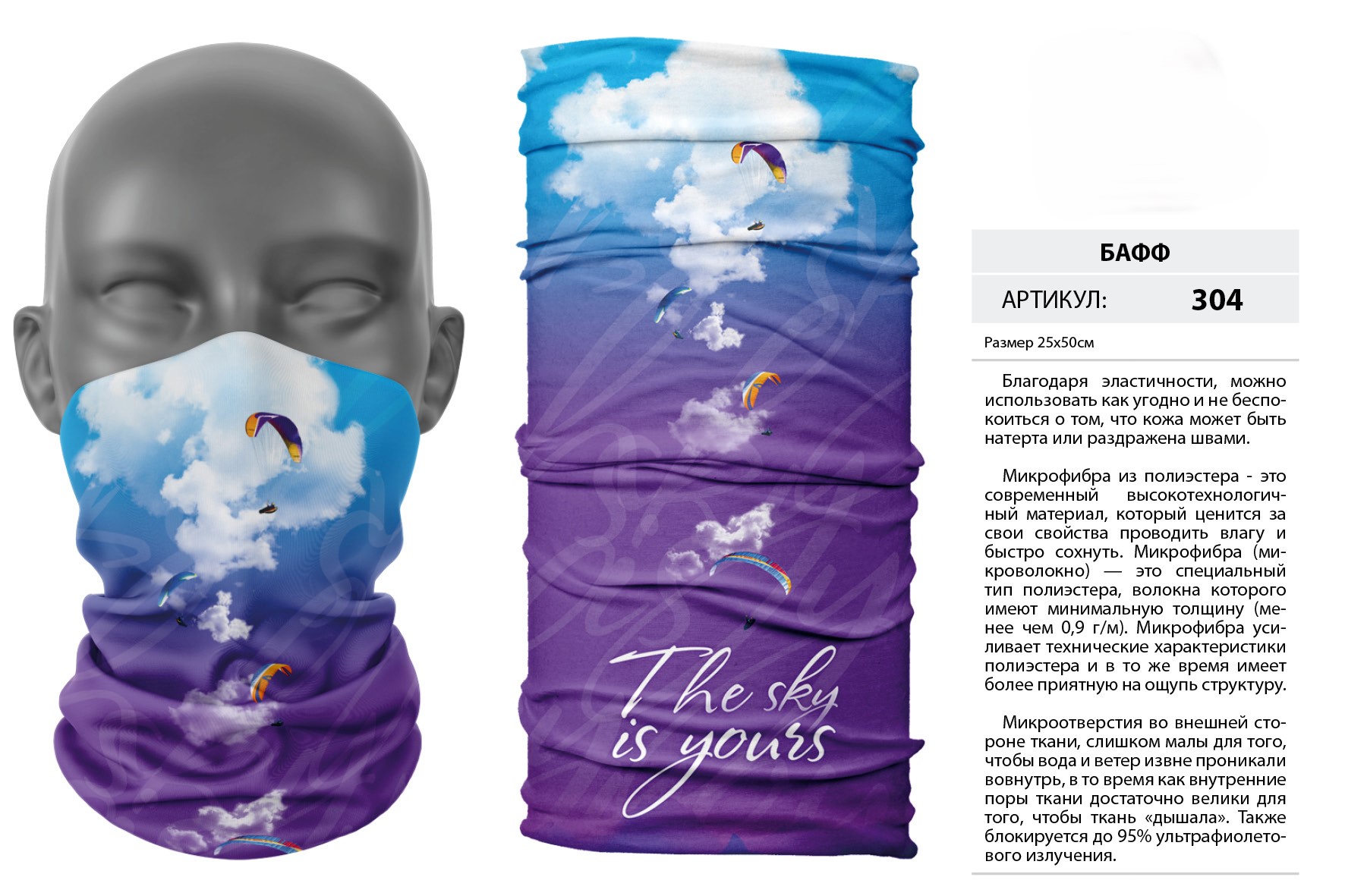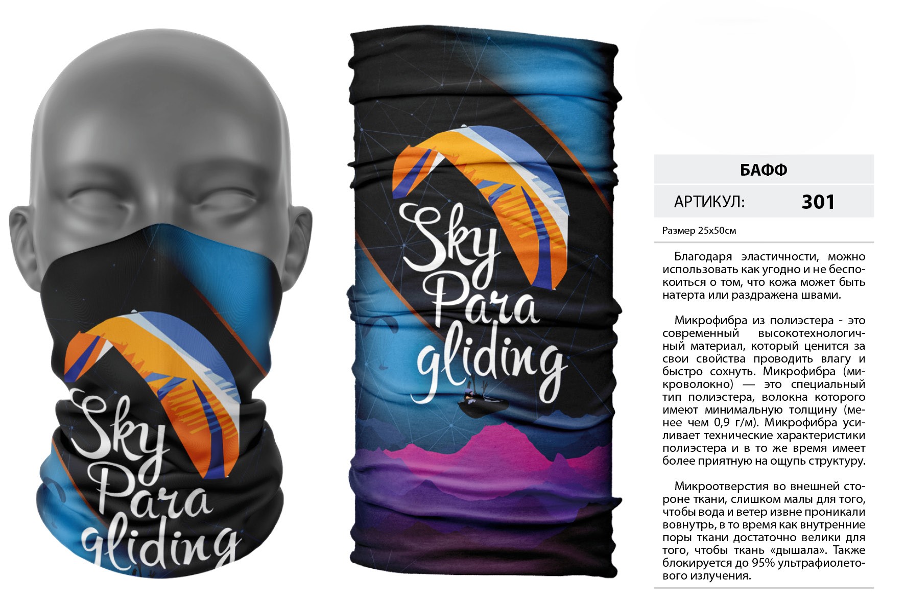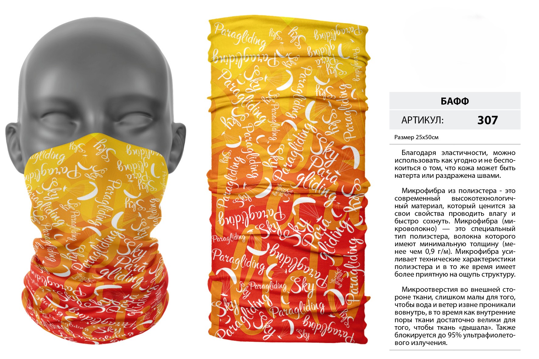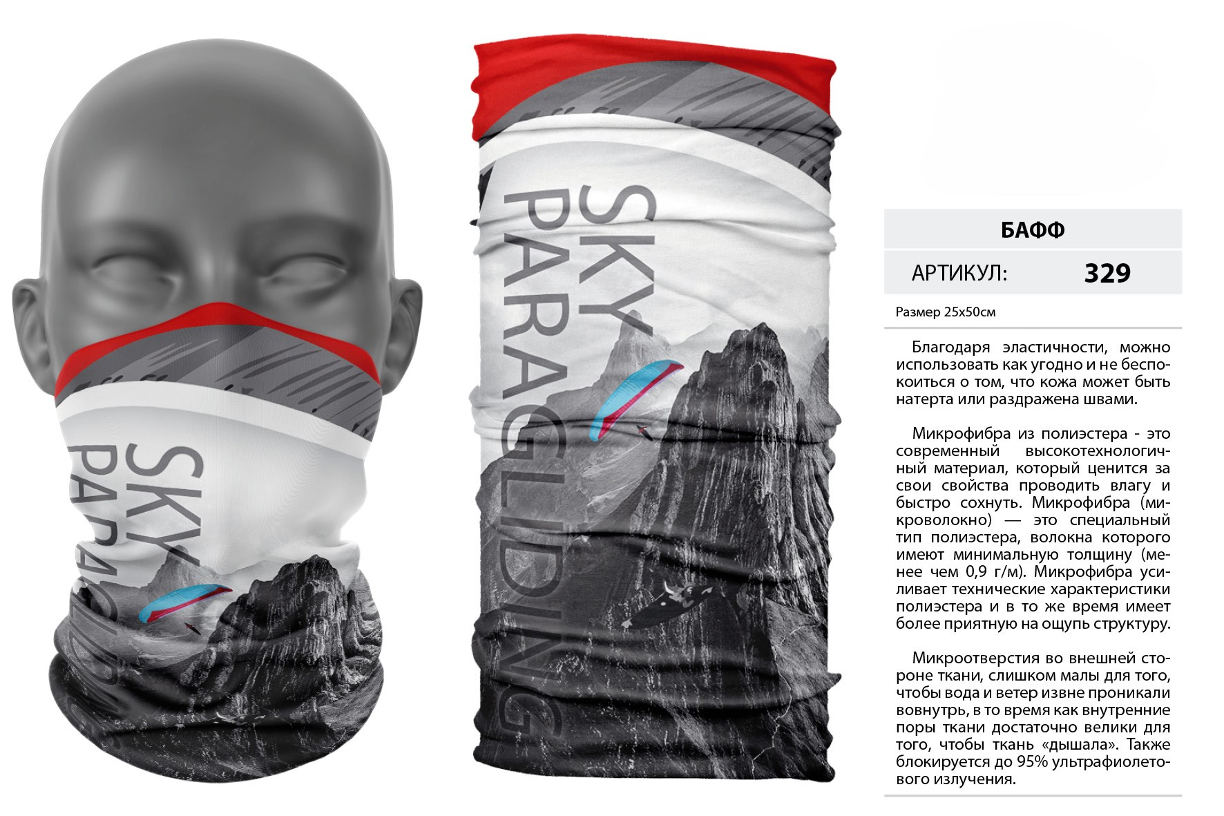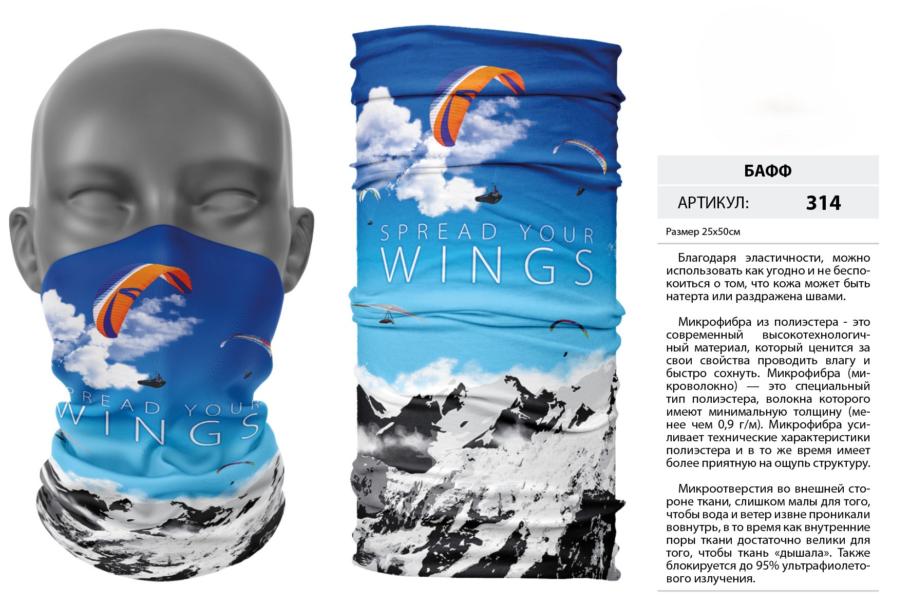 Верх остался как и прежде — микрофибра из полиэстера. Низ сделан из спортивного флиса, который тянется на 300% в ширину и имеет такой-же принт, как и основной бафф с небольшим оттенком (разные материалы по разному впитывают краску, поэтому будет немного отличаться).