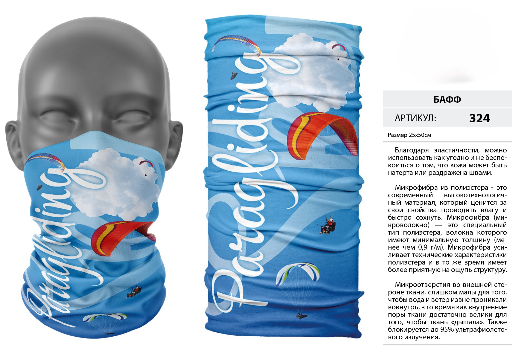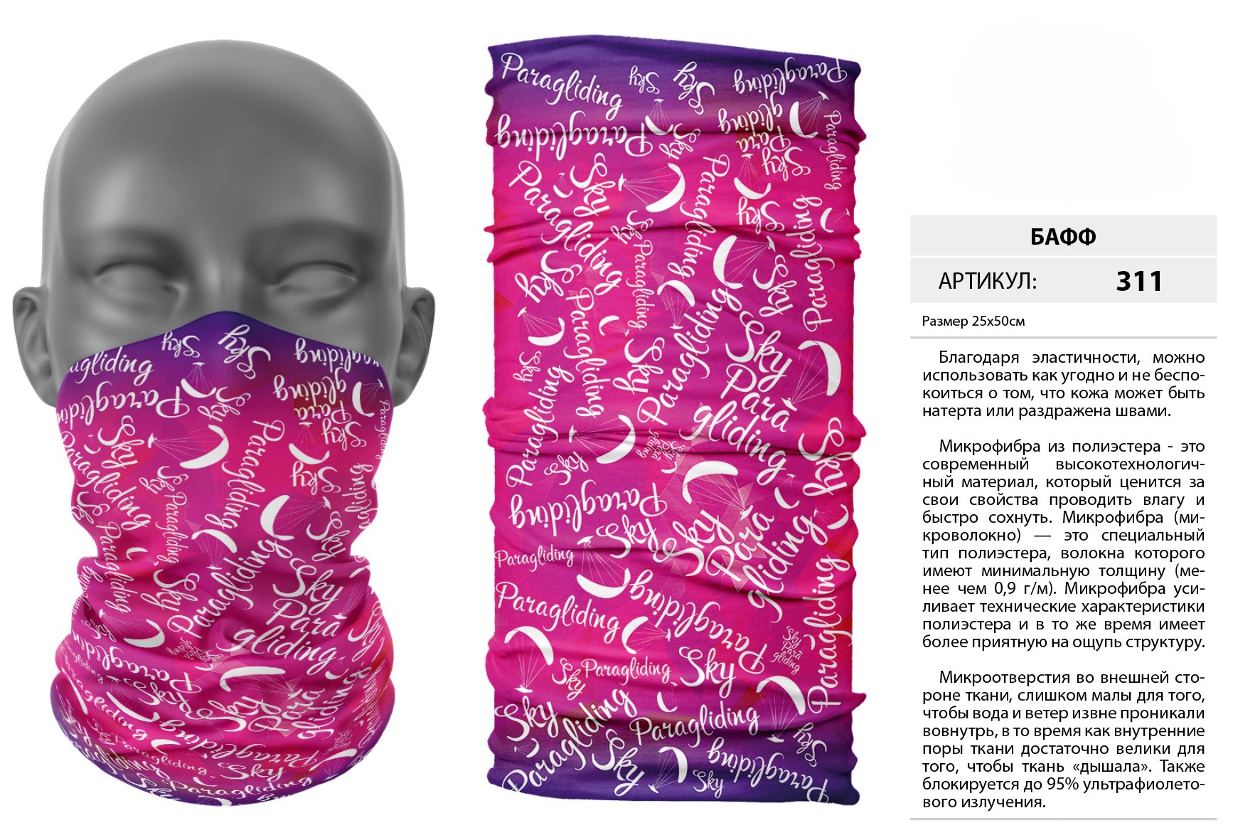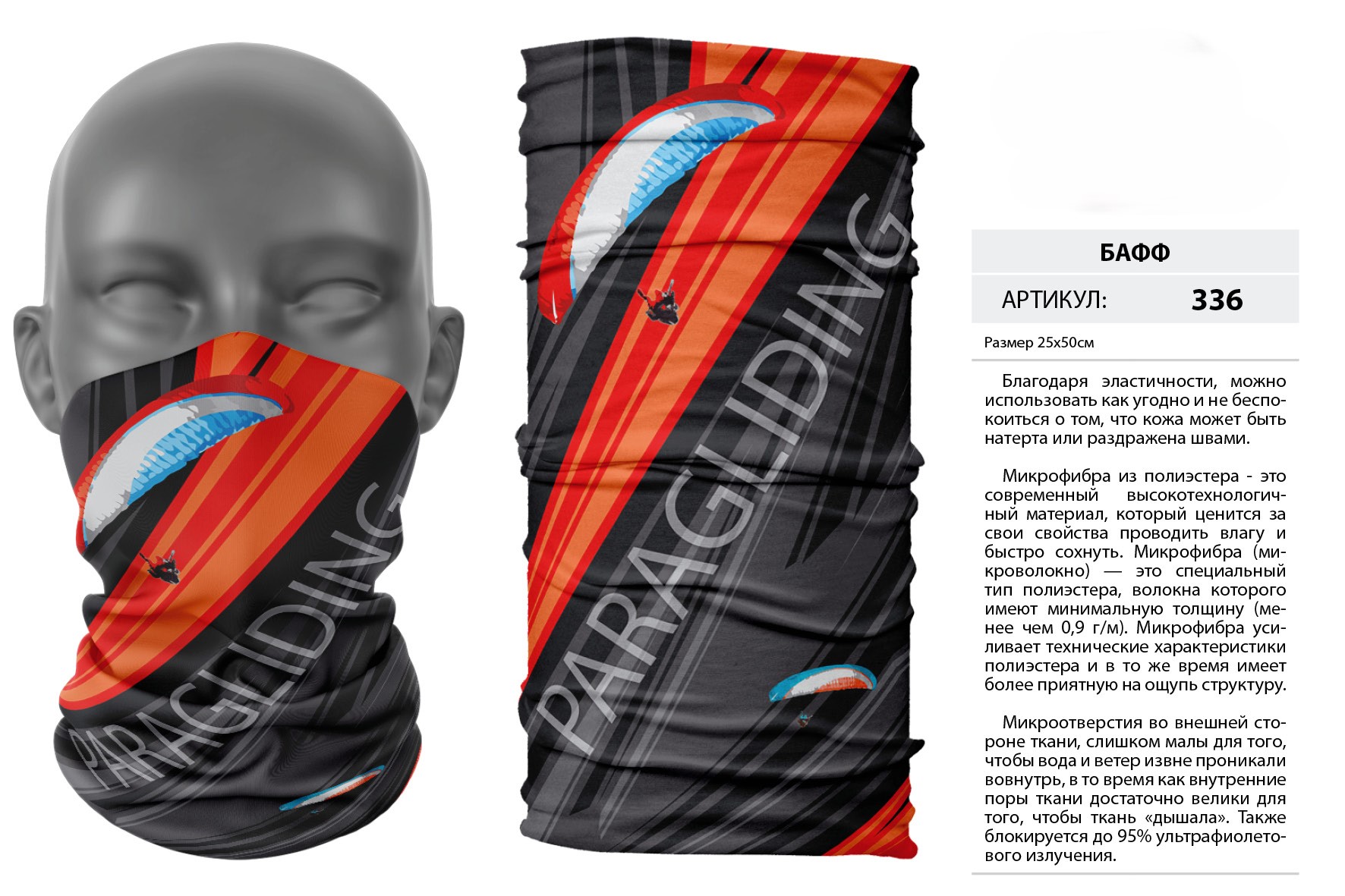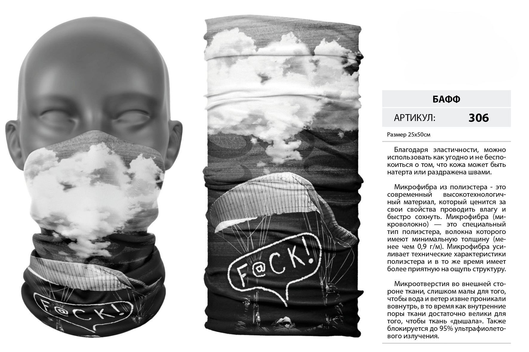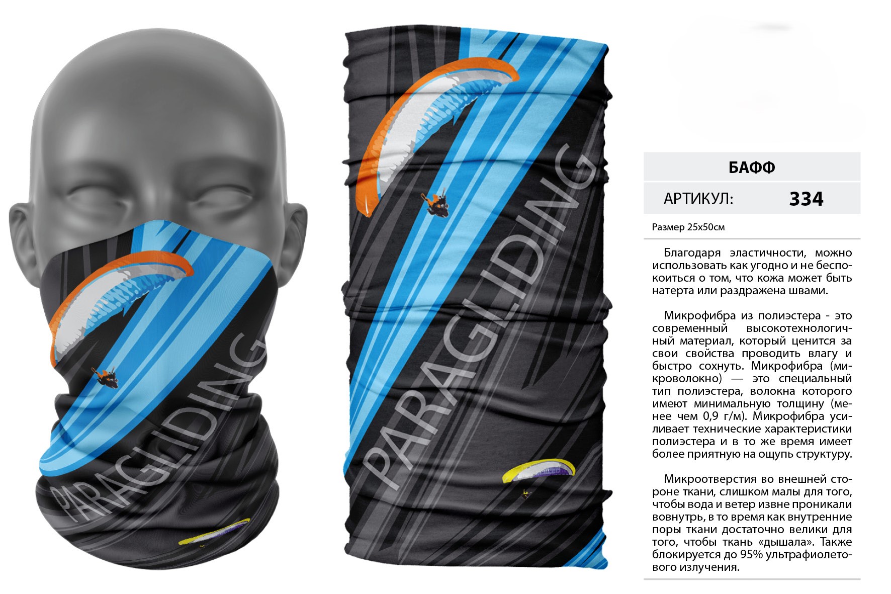 Верх остался как и прежде — микрофибра из полиэстера. Низ сделан из спортивного флиса, который тянется на 300% в ширину и имеет такой-же принт, как и основной бафф с небольшим оттенком (разные материалы по разному впитывают краску, поэтому будет немного отличаться).