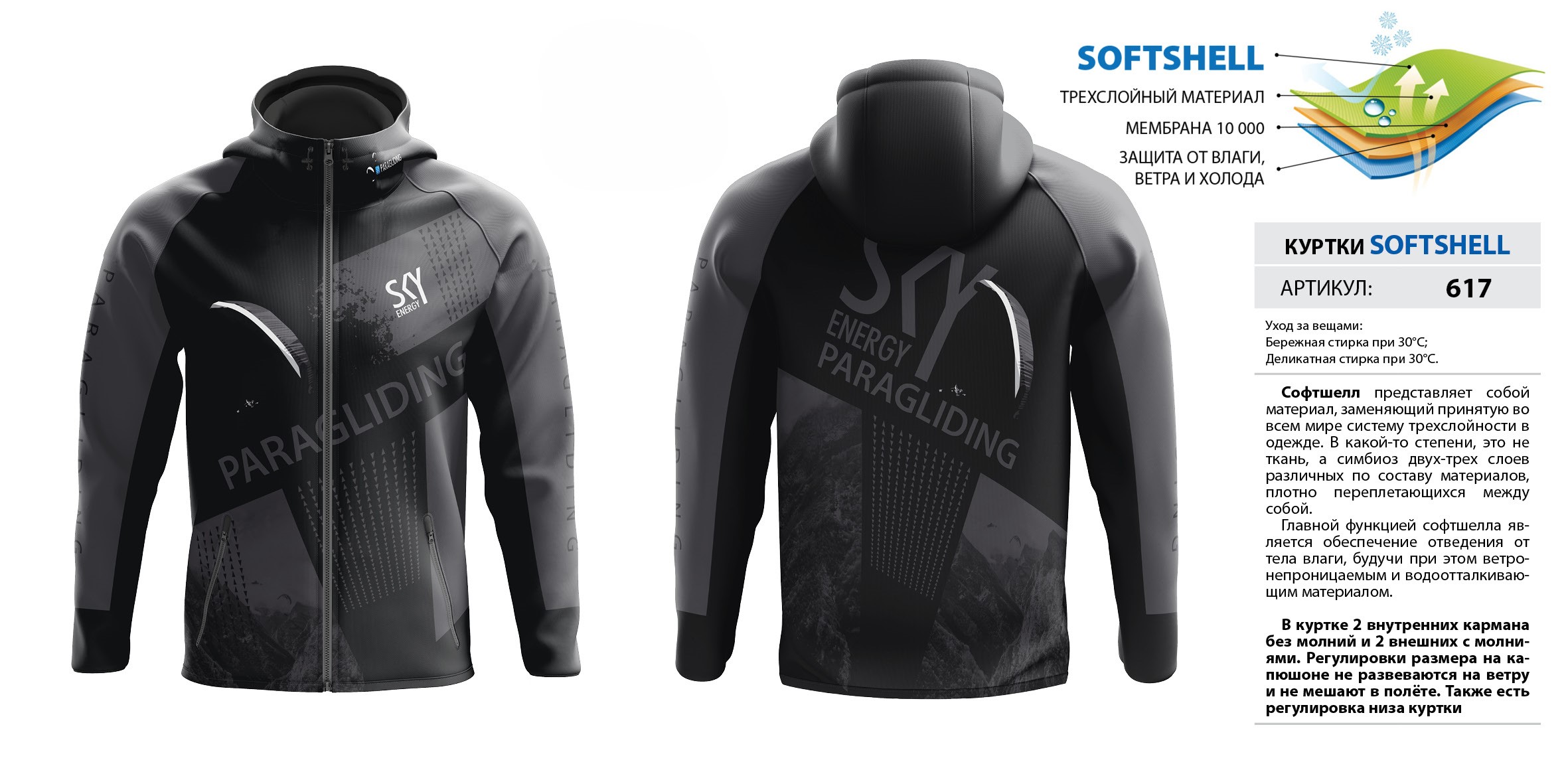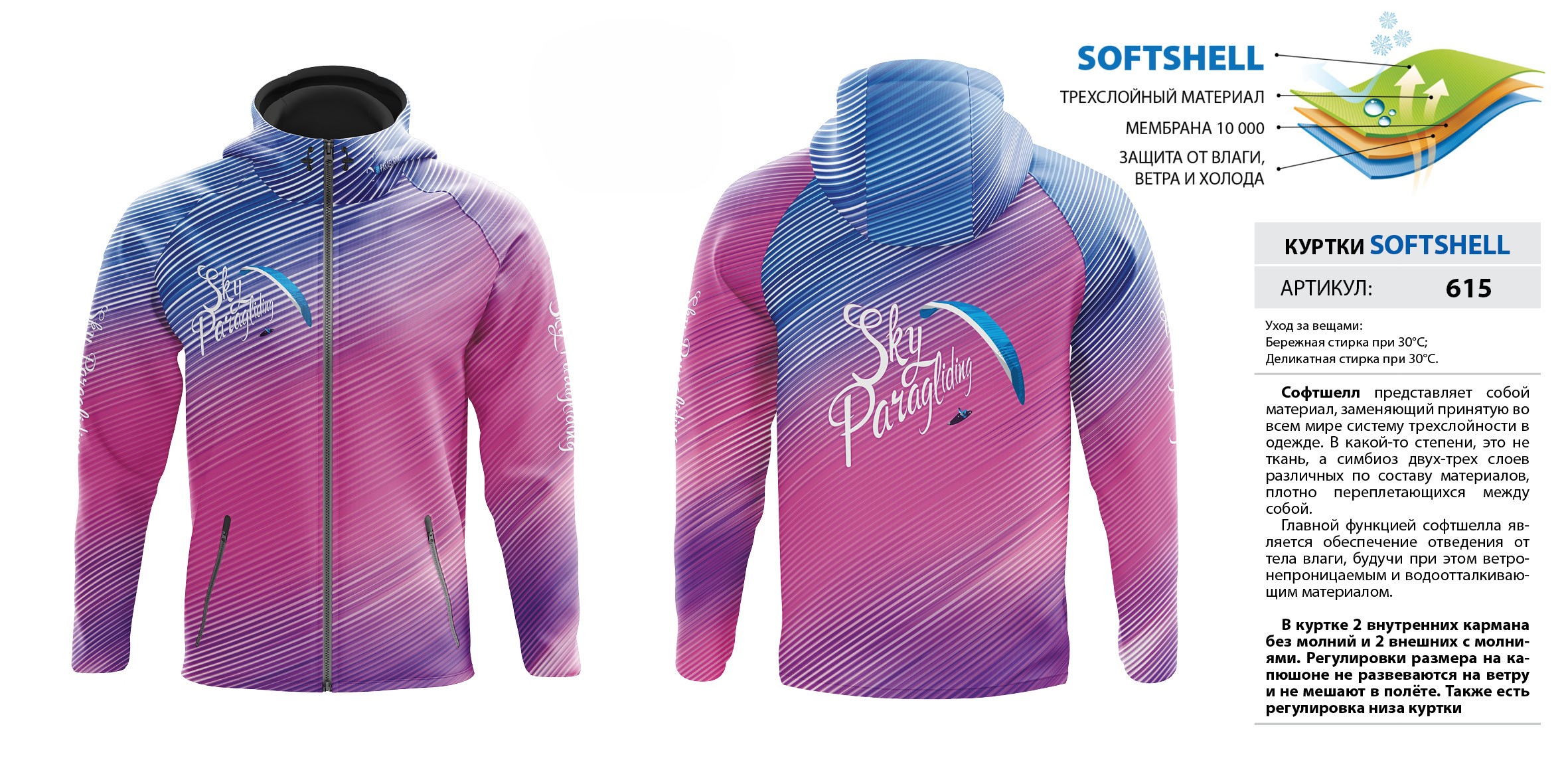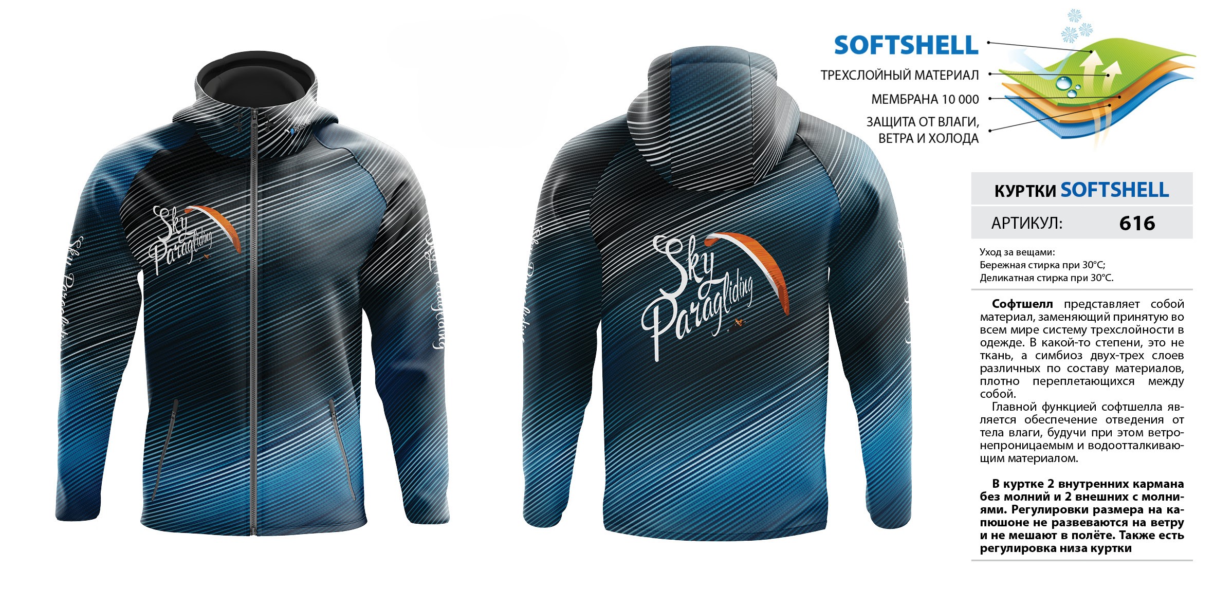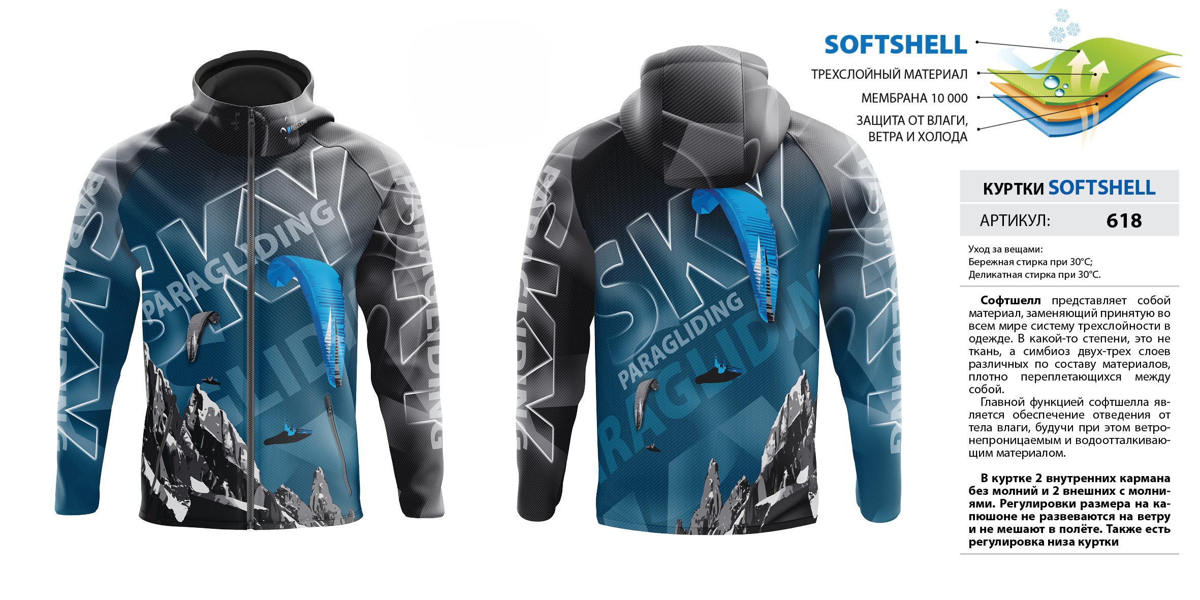В куртке 2 внутренних кармана без молний и 2 внешних с молниями. Регулировки размера на капюшоне не развеваются на ветру и не мешают в полёте. Также есть регулировка низа куртки. Мембрана 10 000.