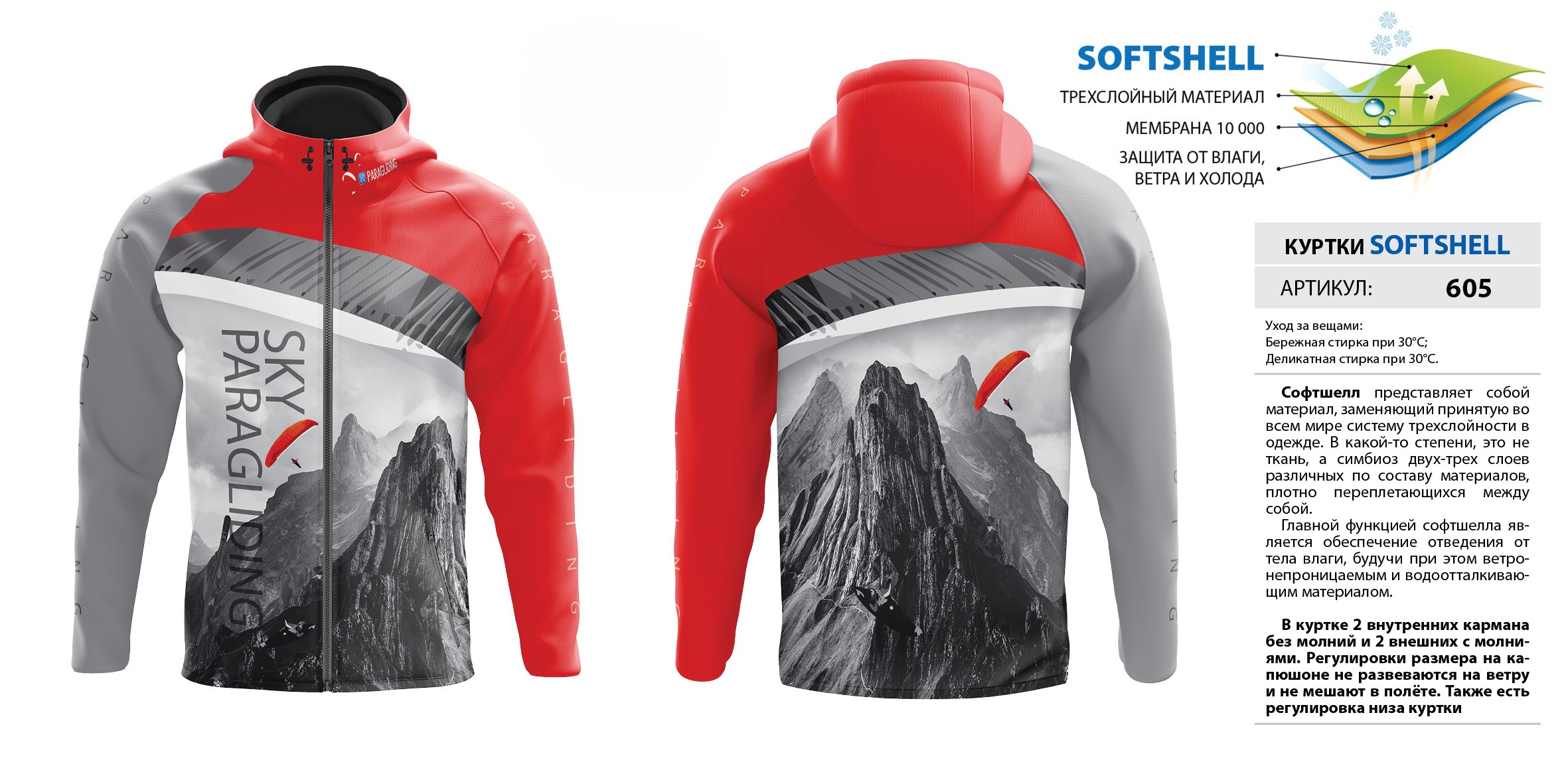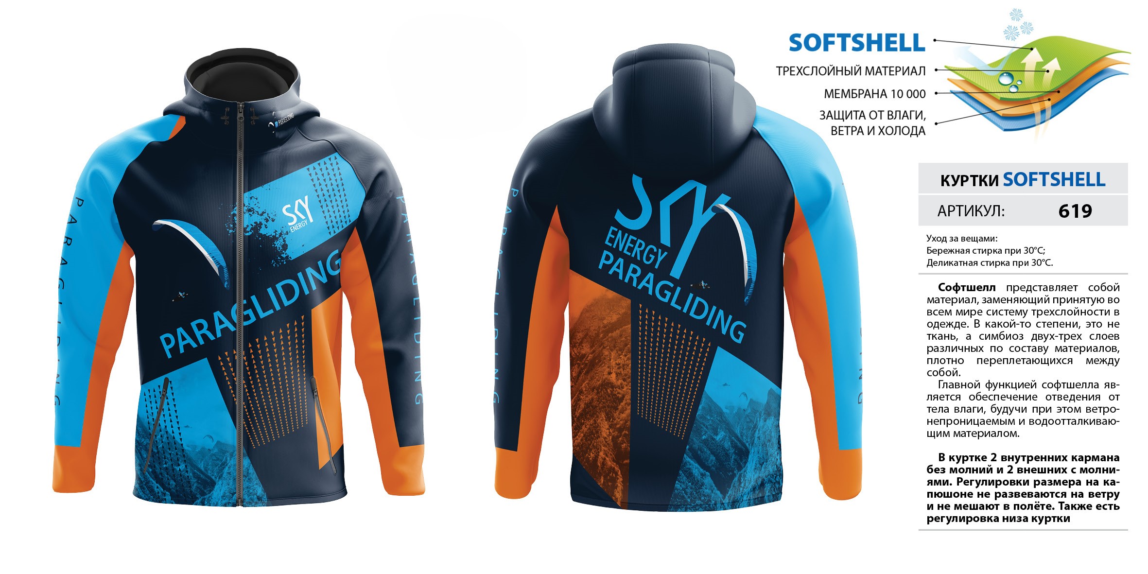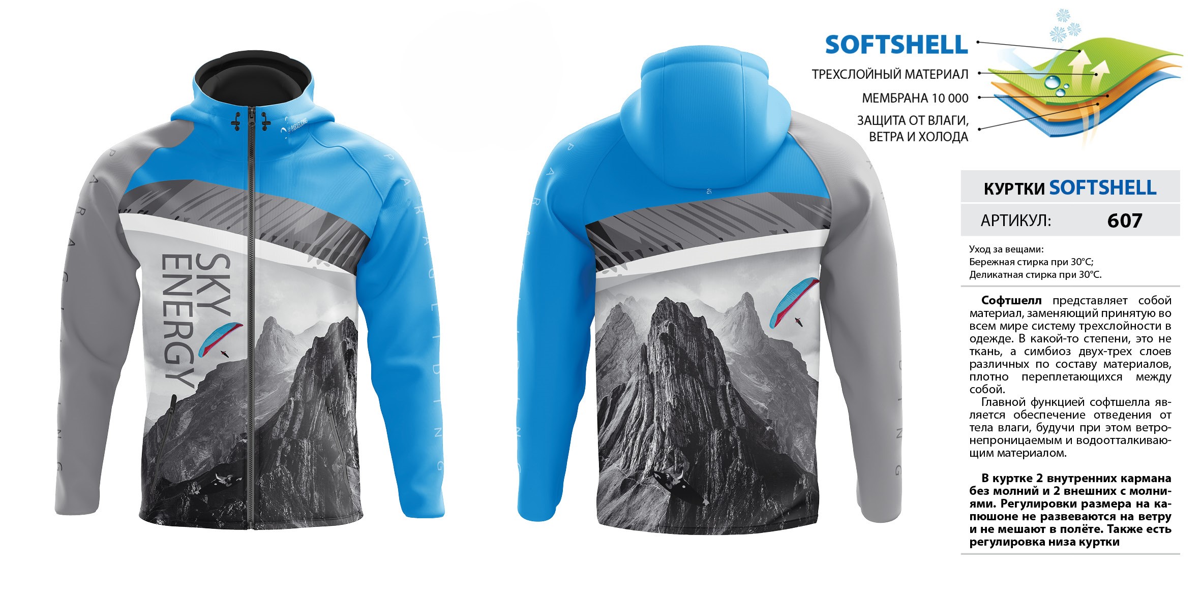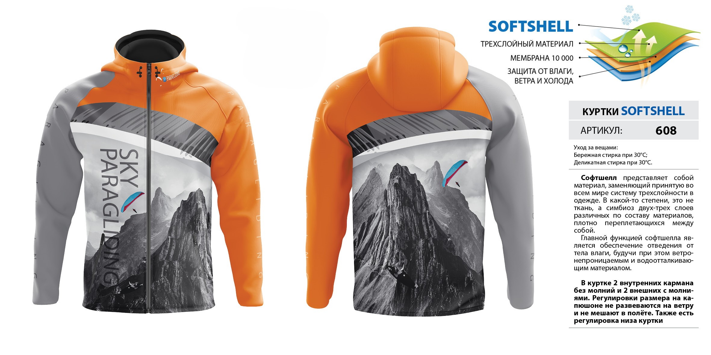 В куртке 2 внутренних кармана без молний и 2 внешних с молниями. Регулировки размера на капюшоне не развеваются на ветру и не мешают в полёте. Также есть регулировка низа куртки. Мембрана 10 000.
