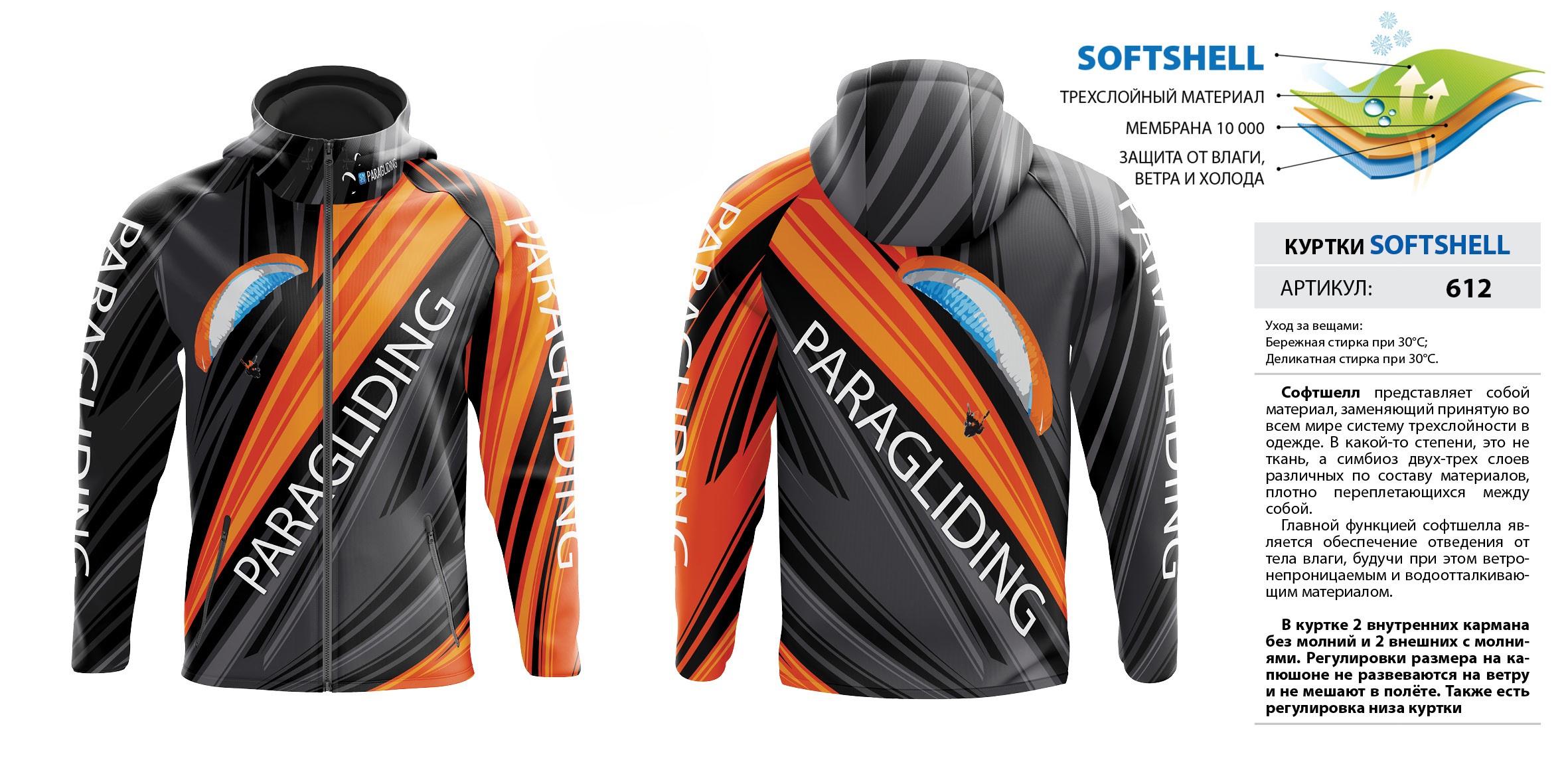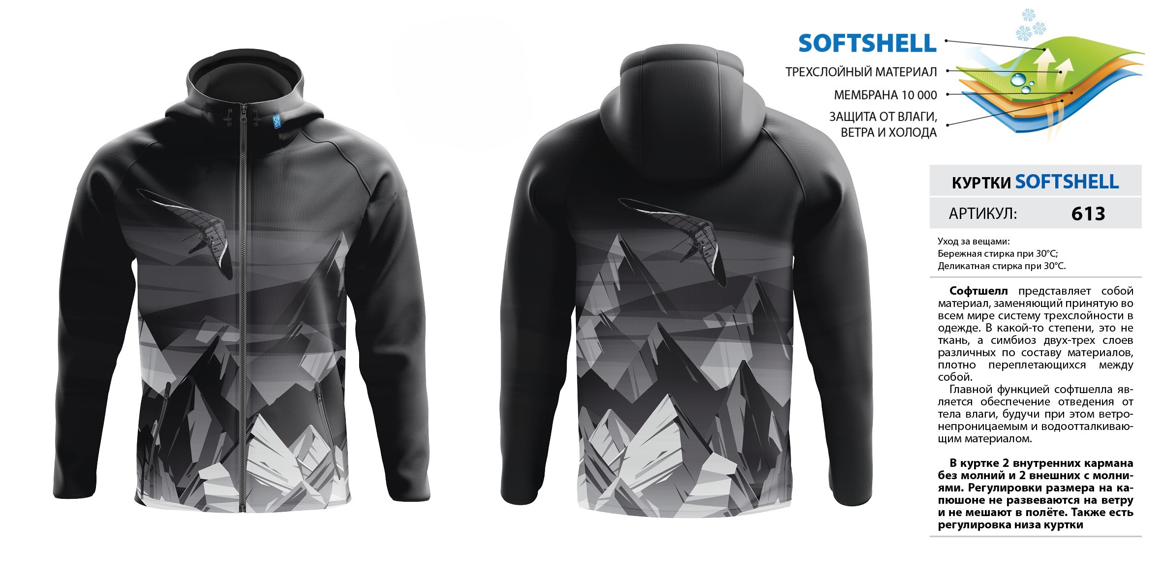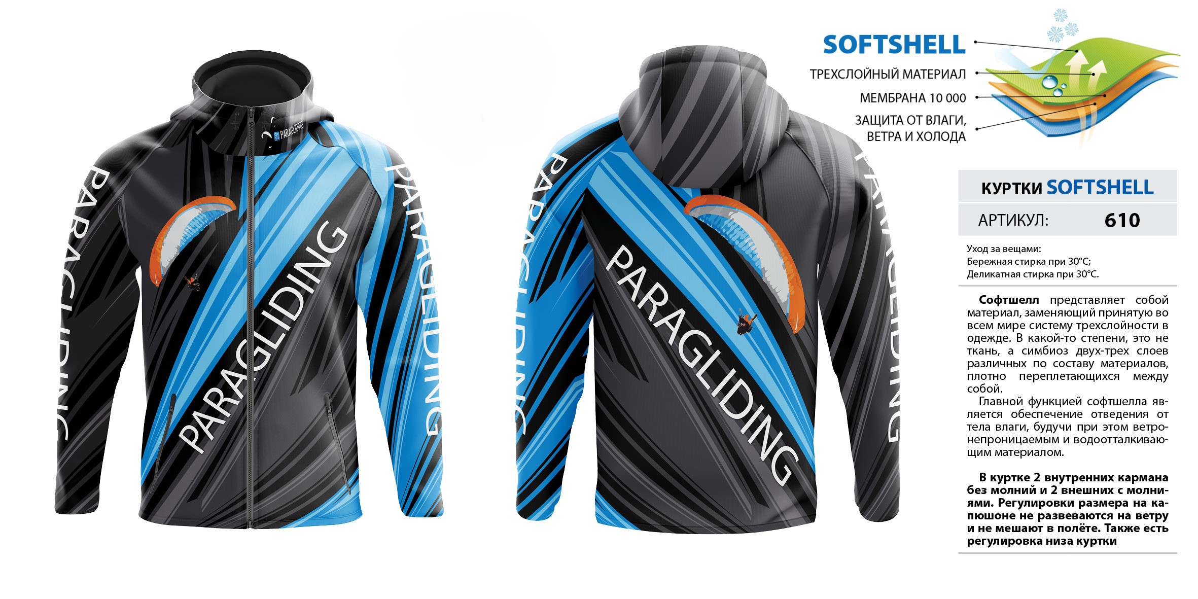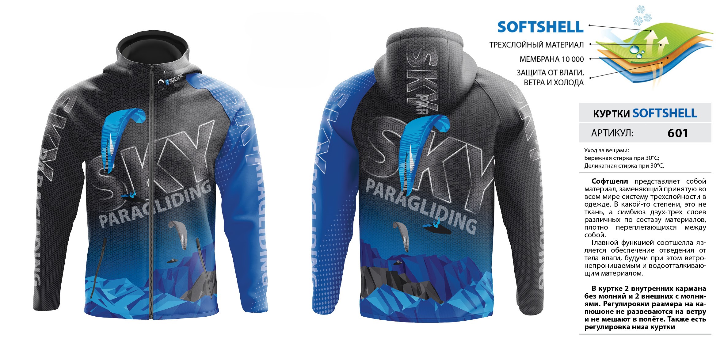В куртке 2 внутренних кармана без молний и 2 внешних с молниями. Регулировки размера на капюшоне не развеваются на ветру и не мешают в полёте. Также есть регулировка низа куртки. Мембрана 10 000.