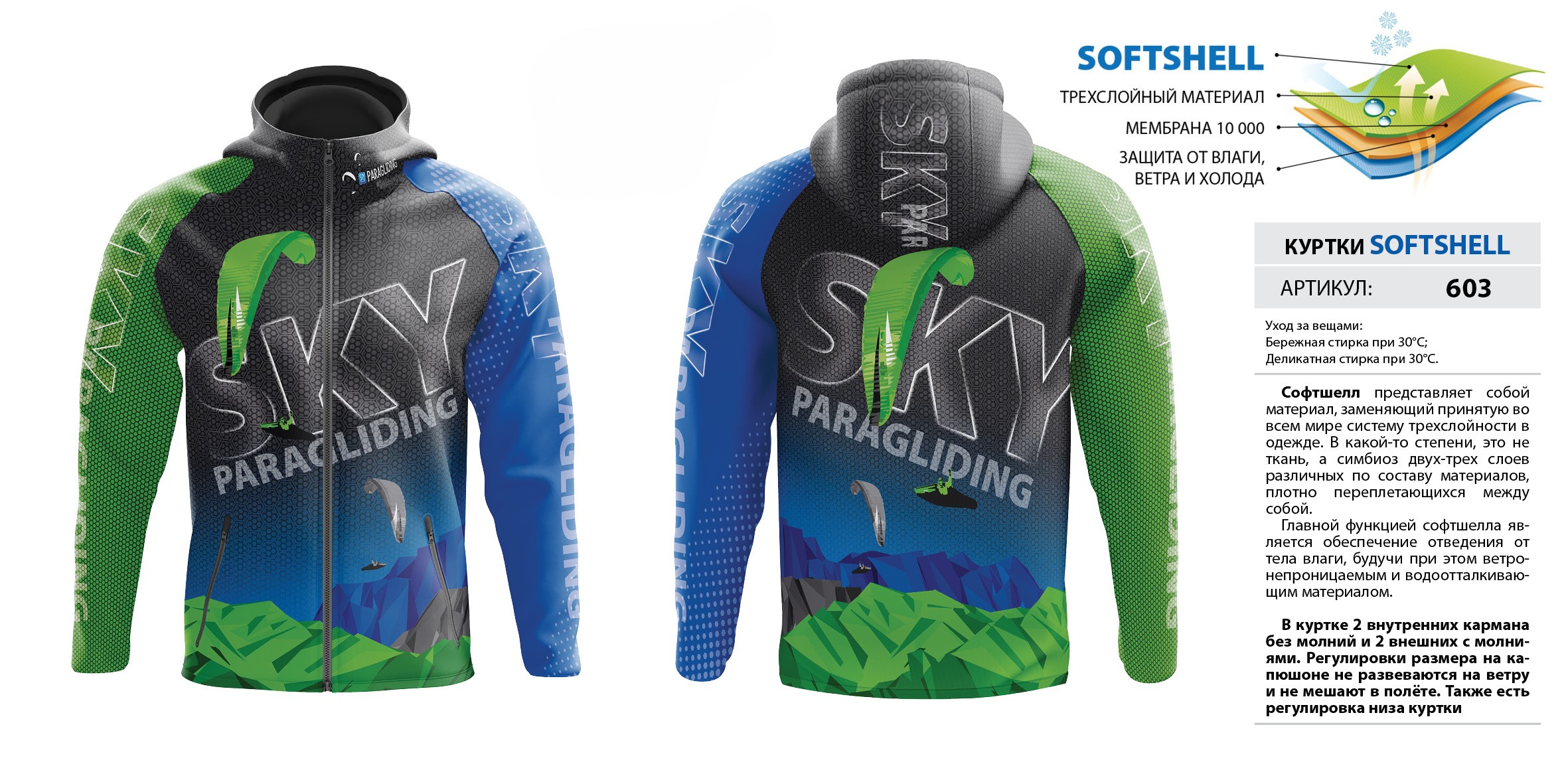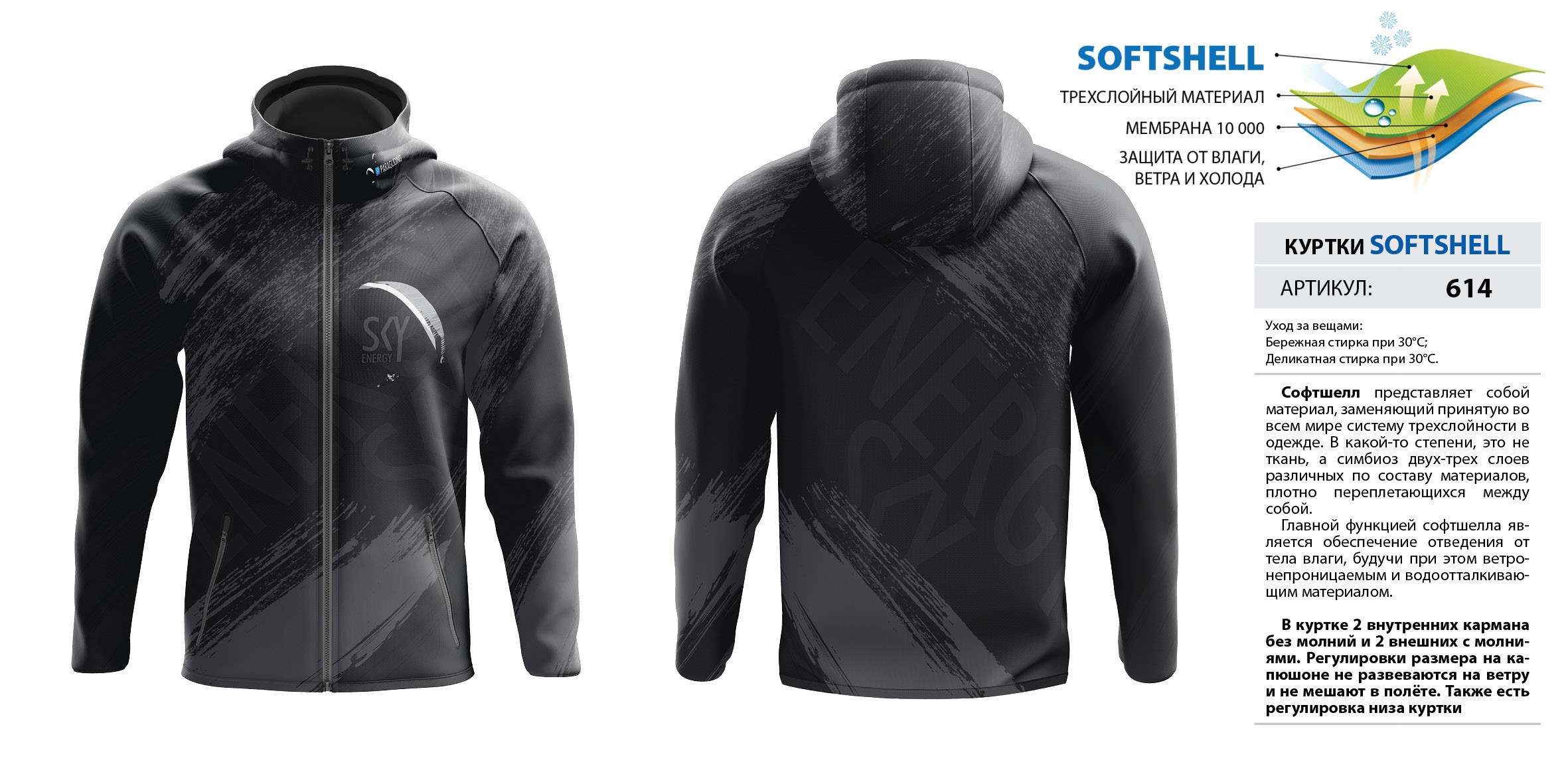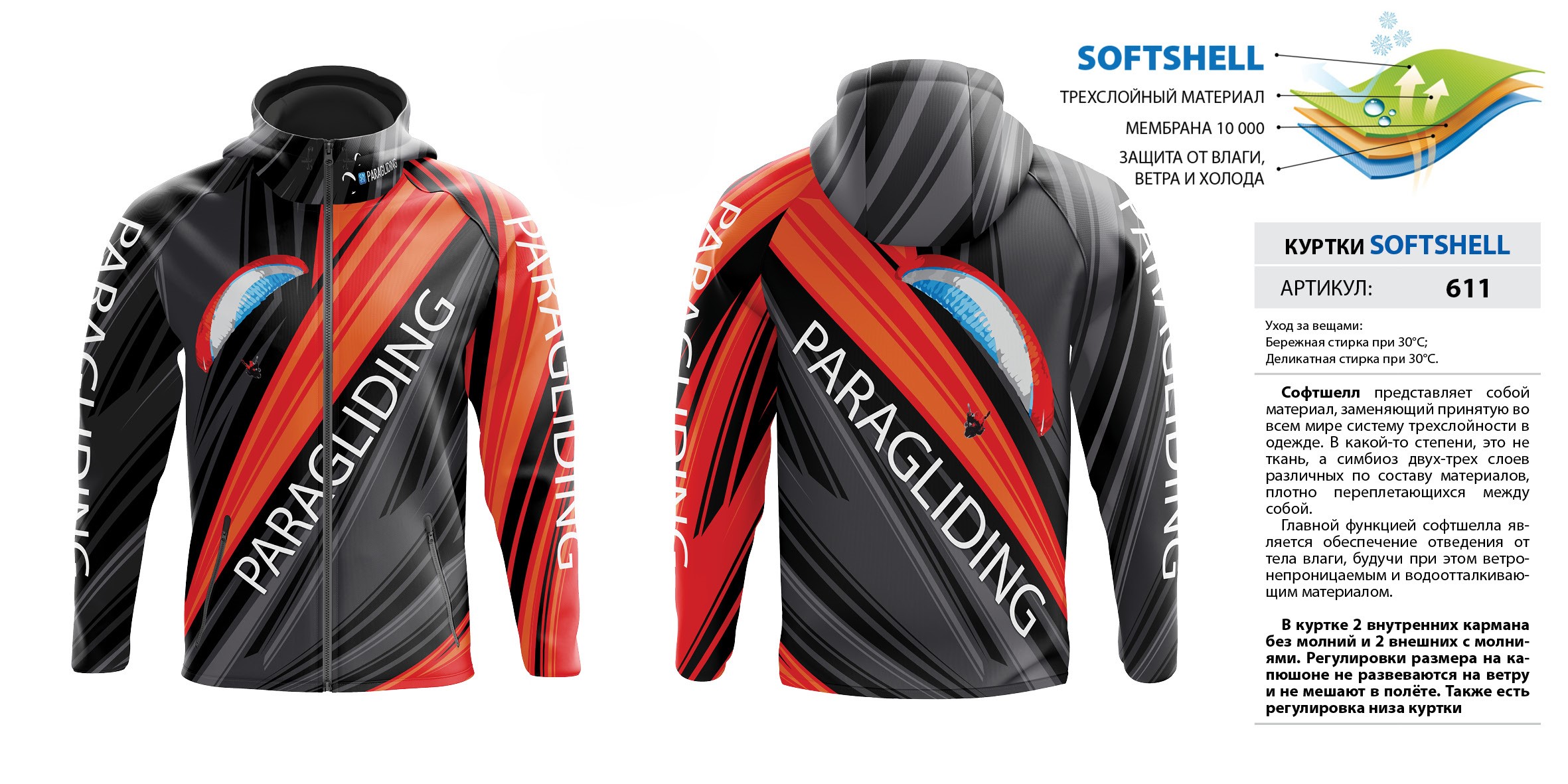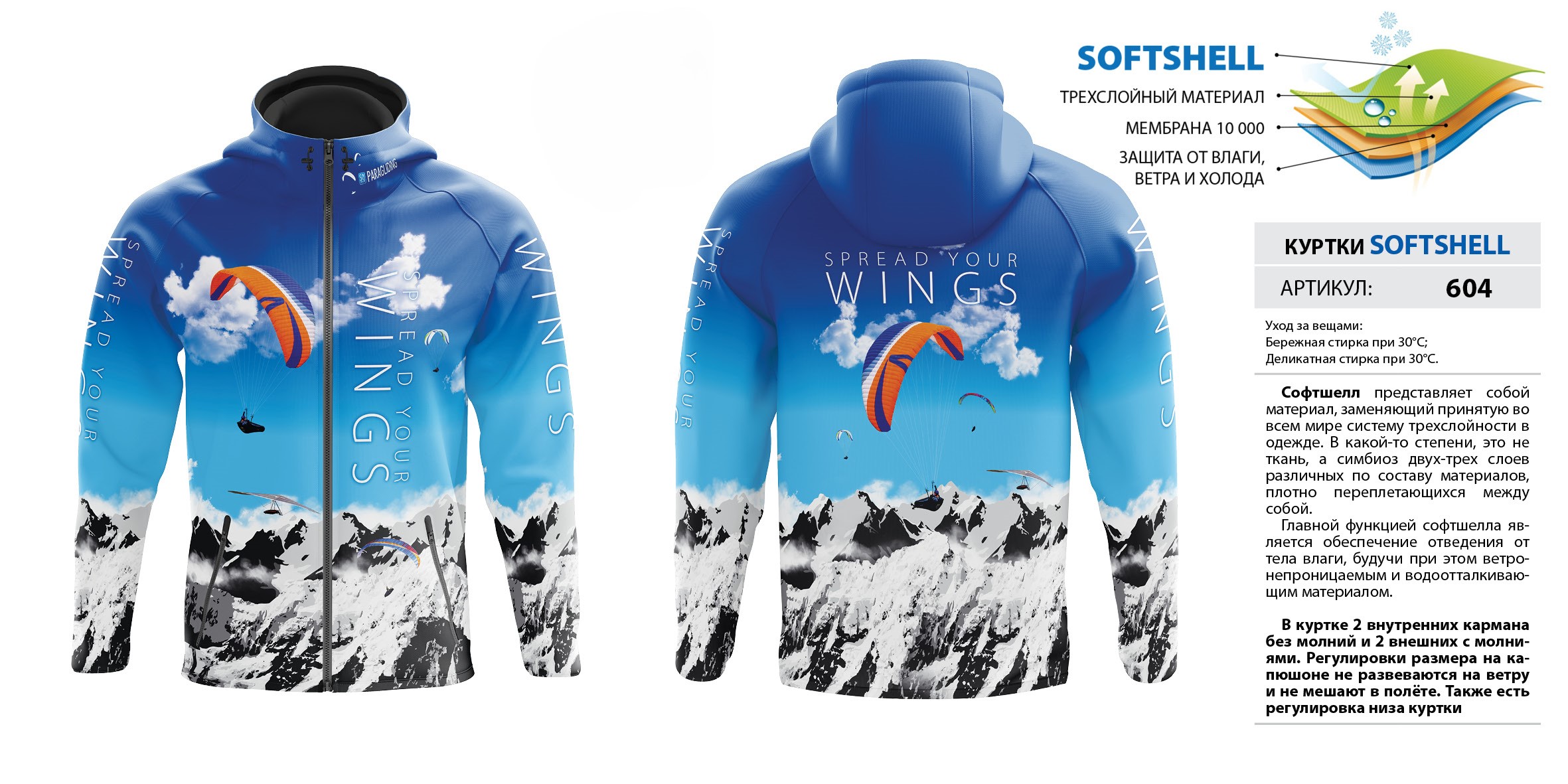 В куртке 2 внутренних кармана без молний и 2 внешних с молниями. Регулировки размера на капюшоне не развеваются на ветру и не мешают в полёте. Также есть регулировка низа куртки. Мембрана 10 000.