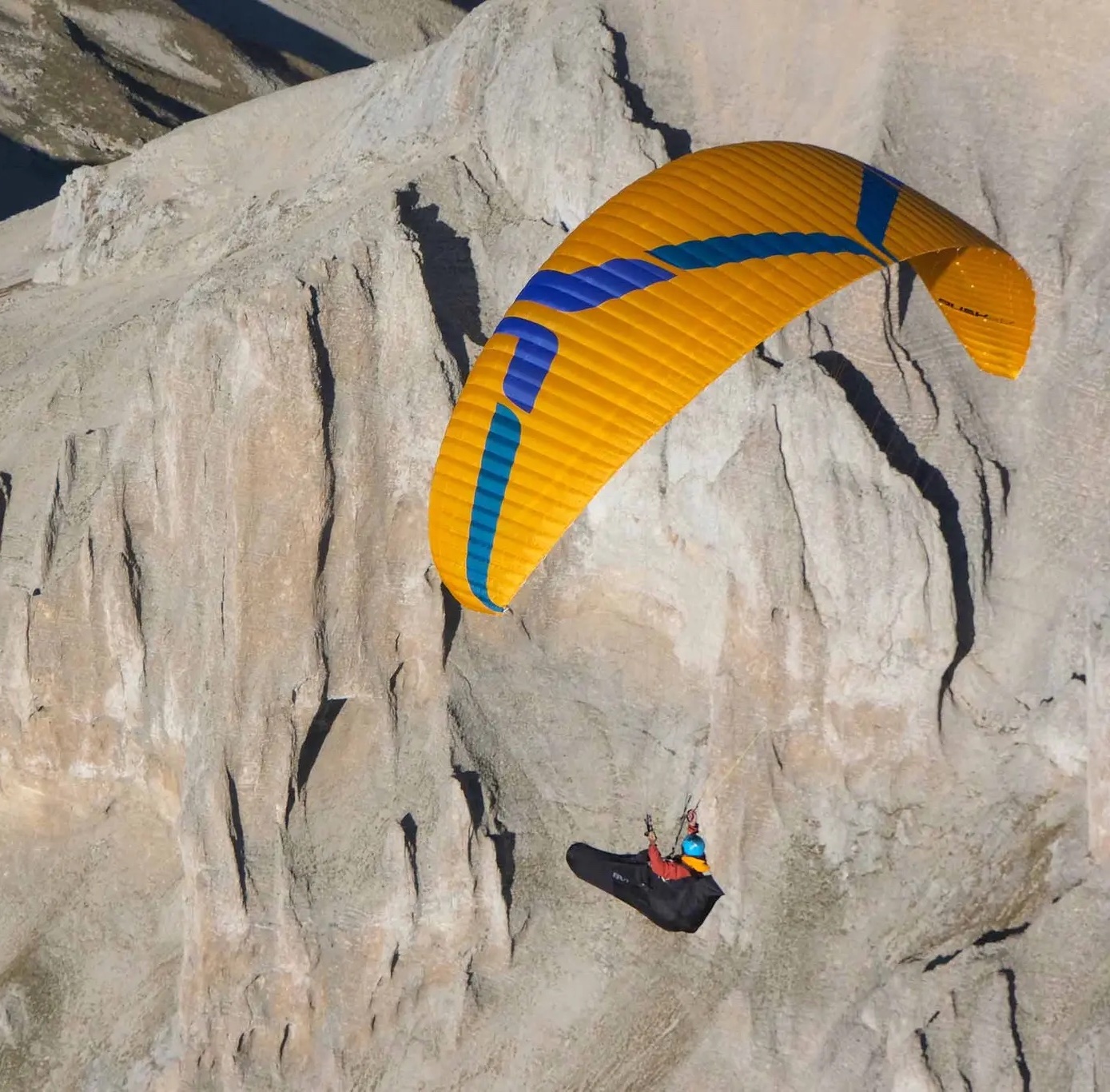 Вся конструкция Rush 6 является логичным развитием Delta 4, и это крыло во всех отношениях похоже. Удлинение сохранено умеренным для повышения пассивной безопасности и удовольствия от полета. Улучшение характеристик достигнуто за счет оптимизации компоновки 3/2 стропной системы, новой дополнительной 3D-структуры, разделяющей переднюю кромку, и модификаций формы панелей и конструкции задней кромки/мини-ребр — все это приводит к значительному снижению паразитного сопротивления и, как следствие, к увеличению планирования и скорости.